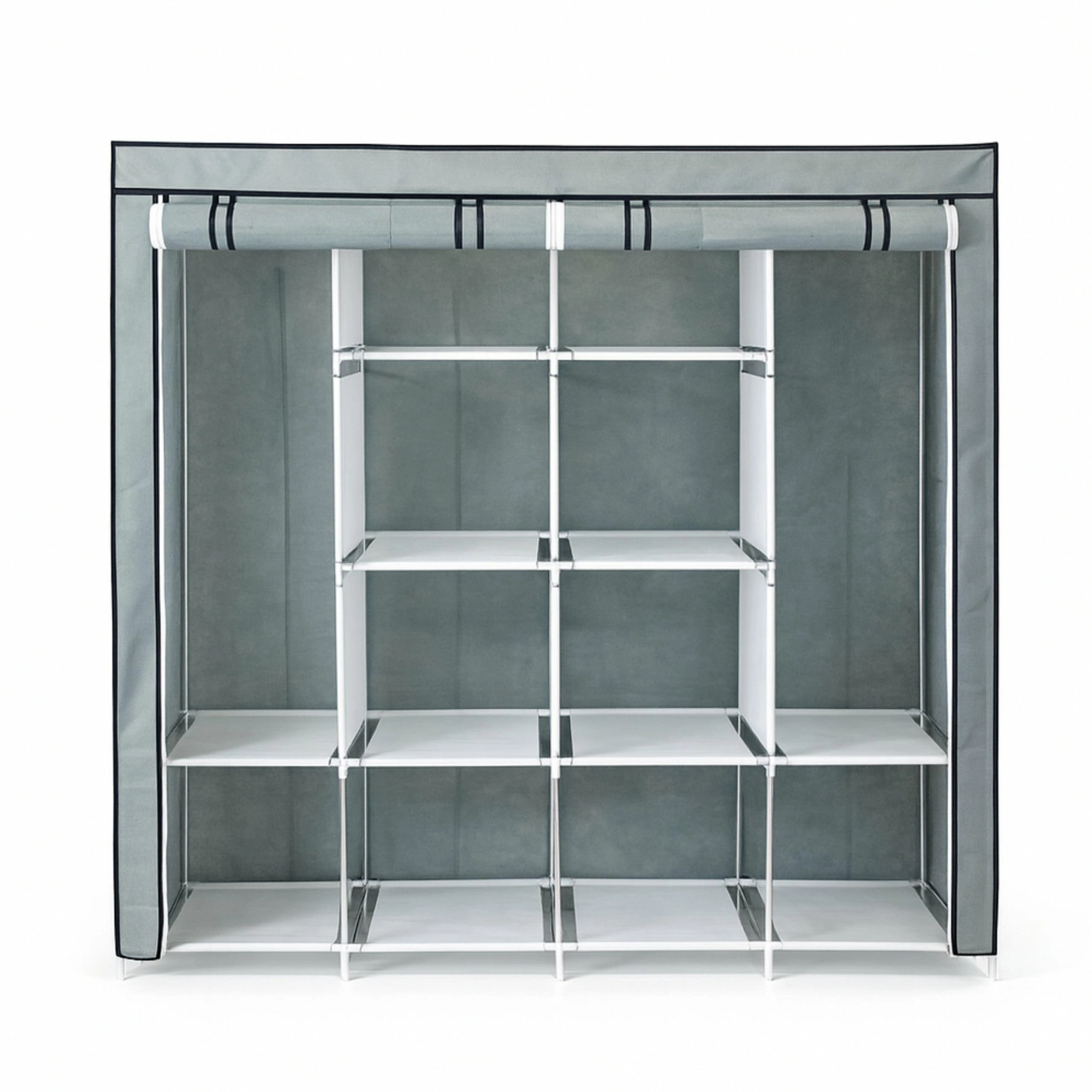 Praktická textilná skriňa v elegantnej sivej farbe ponúka veľký úložný priestor, nízku hmotnosť a mobilitu a zároveň stabilnú konštrukciu z kovových trubiek. Vďaka 12 policiam, 2 šatníkovým tyčiam a bočným vreckám ľahko usporiadate všetko oblečenie aj doplnky. Odolný poťah chráni odevy pred prachom a skriňa sa hodí do spálne, šatne, kancelárie aj detskej izby.