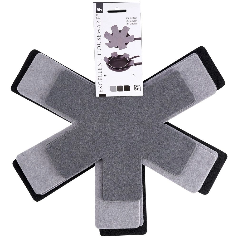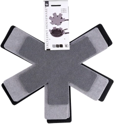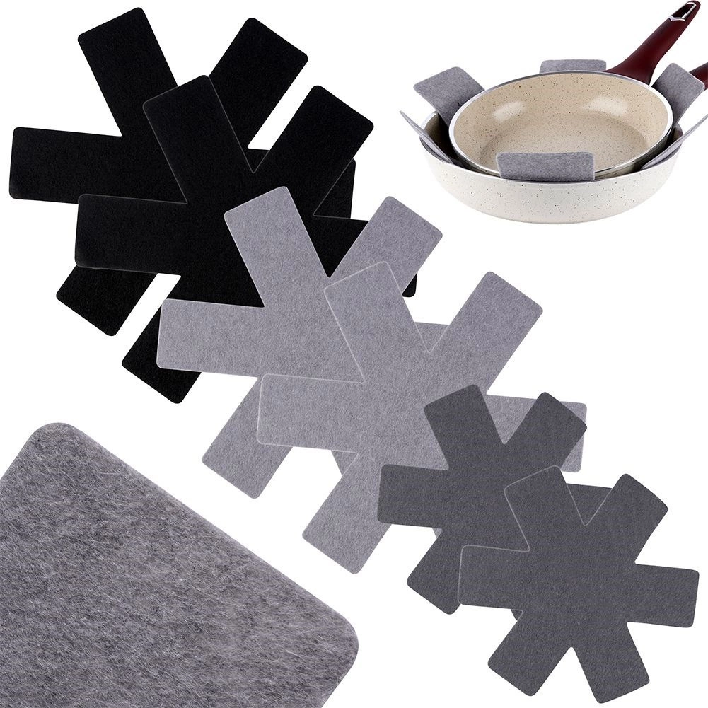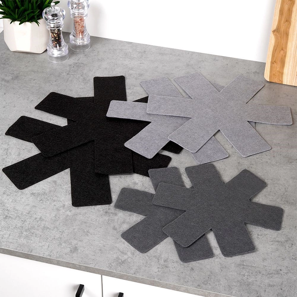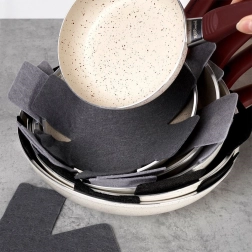 Praktická sada filcových vložiek na bezpečné stohovanie panvíc, hrncov a mís. V balení je 6 kusov v troch veľkostiach, ktoré spoľahlivo zabránia poškrabaniu nepriľnavých povrchov a šetria miesto v skrinkách. Chránia riad, zabraňujú oderom a umožňujú bezstarostné ukladanie na seba.