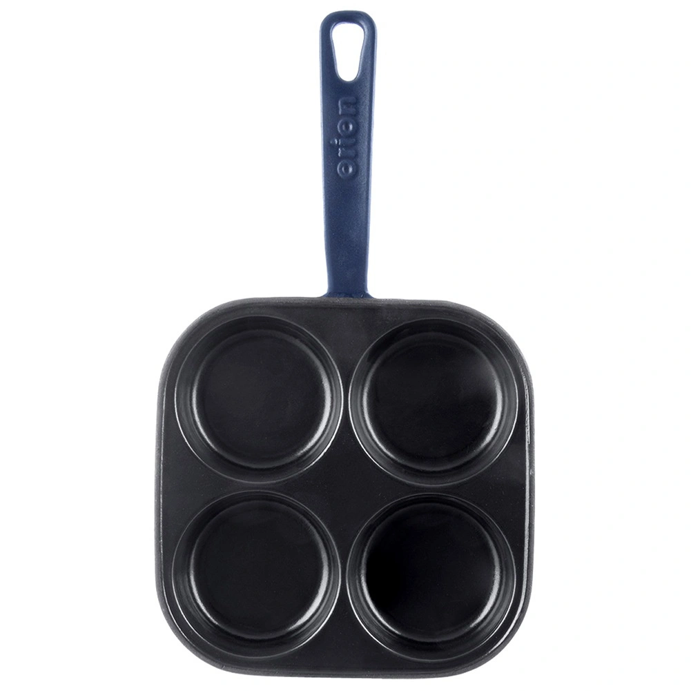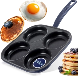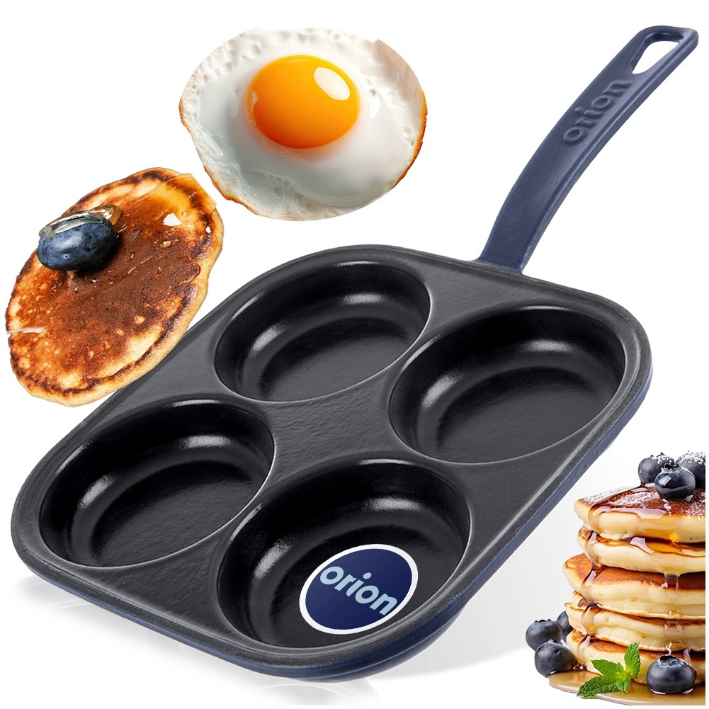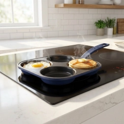 Štvorcová liatinová panvica s rozmermi 20,5 × 20,5 cm a štyrmi oddelenými miskami (Ø 9 cm) zabezpečí rýchlu prípravu vajec, lievancov aj mini palaciniek v perfektnom tvare. Smaltovaný povrch v čiernej farbe minimalizuje pripálenie a uľahčuje servírovanie, vonkajšia časť a rukoväť v modrom odtieni dodávajú panvici elegantný vzhľad.
