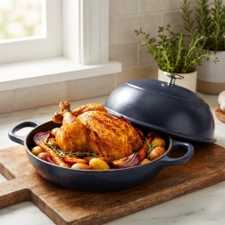 Táto smaltovaná liatinová forma s vekom je ideálna na chrumkavý domáci chlieb, dozlatista upečené kura aj šťavnaté pečienky. Spodná časť slúži ako priestranná liatinová panvica, zatiaľ čo vysoké veko zabezpečí rovnomerné prúdenie tepla a šetrné dusenie.