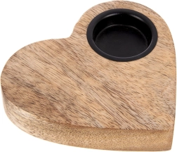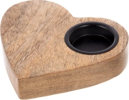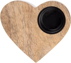 Štýlový svietnik v tvare srdca z prírodného mangového dreva dodá interiéru útulnú atmosféru a romantické svetlo. Kovová vložka bezpečne drží čajovú sviečku (tealight) s priemerom do 4 cm. Skvele vynikne na komode, stole aj na parapete a ľahko ho zladíte s prírodnými aj kovovými doplnkami.
