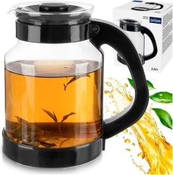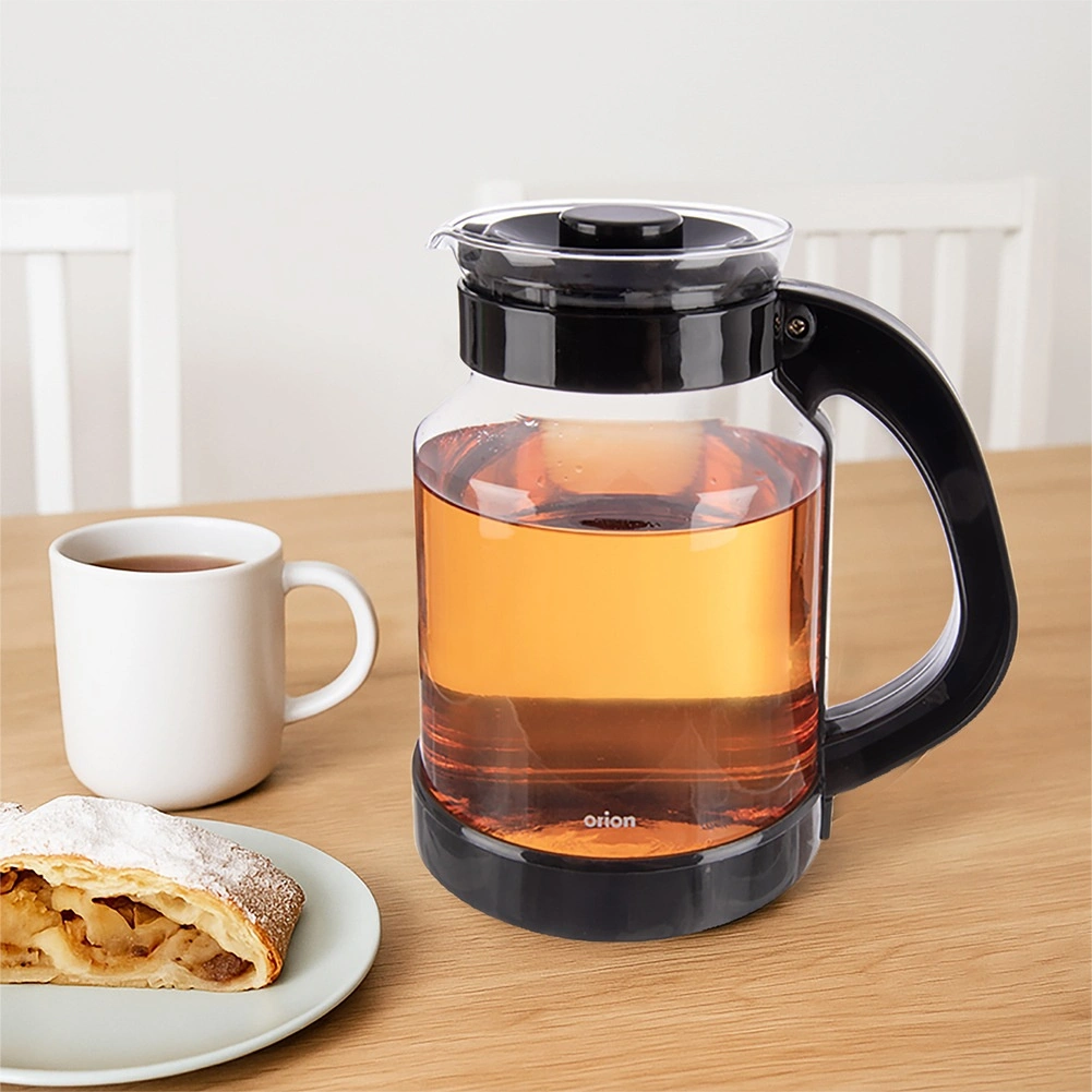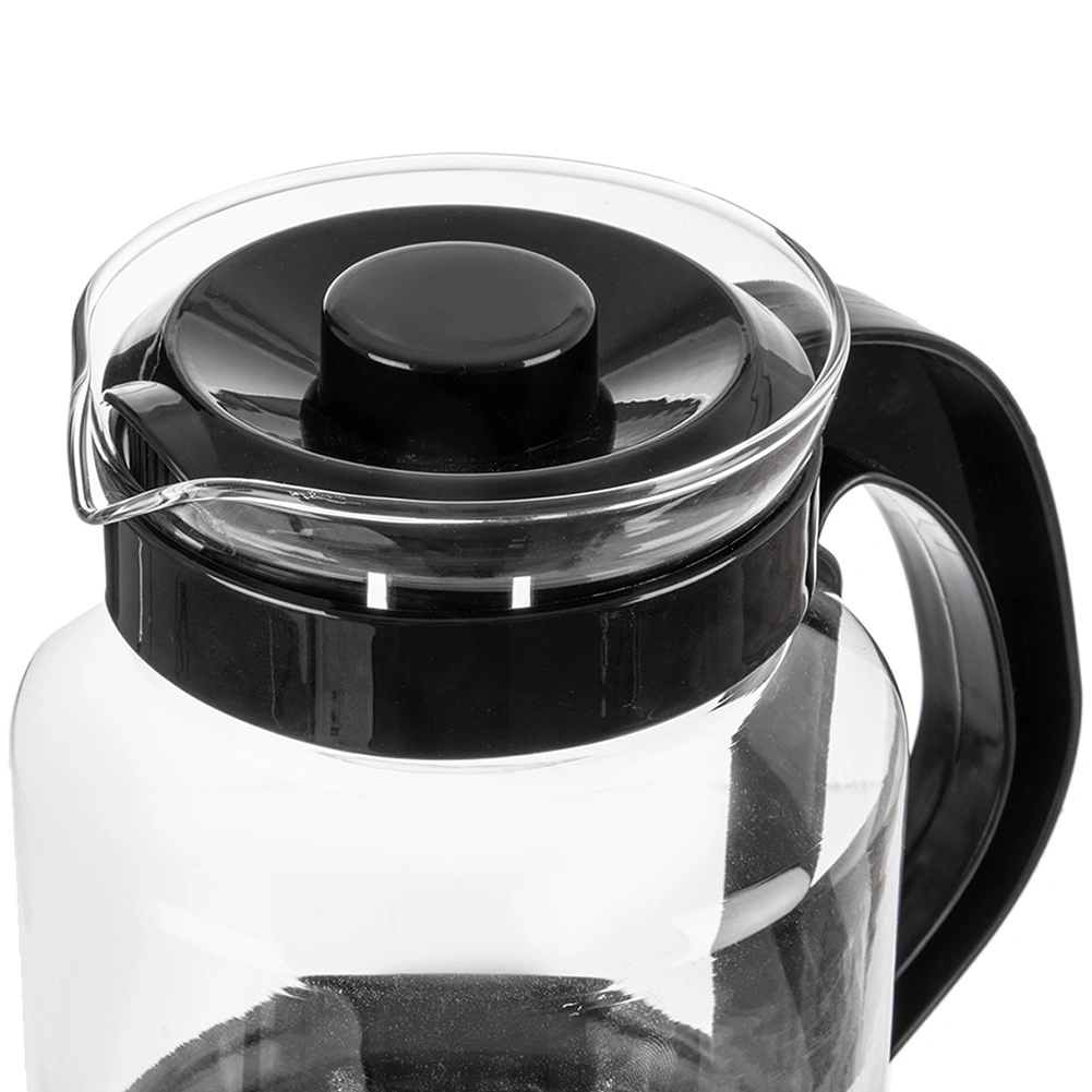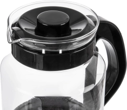 Univerzálny sklenený džbán s objemom 2,25 l na pohodlnú prípravu a servírovanie čaju, kávy aj studených nápojov. Vyrobený z odolného borosilikátového skla s čiernym viečkom a ergonomickým uchom na bezpečné nalievanie. Vysoká odolnosť voči teplotám, praktická výlevka a viečko na udržanie čerstvosti robia z tohto džbánu skvelú voľbu na každodenné používanie doma aj v kancelárii.