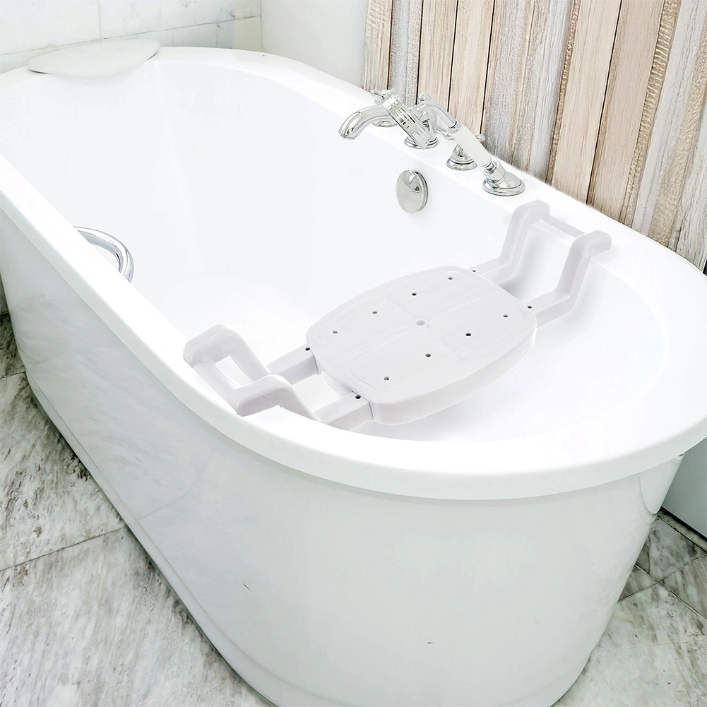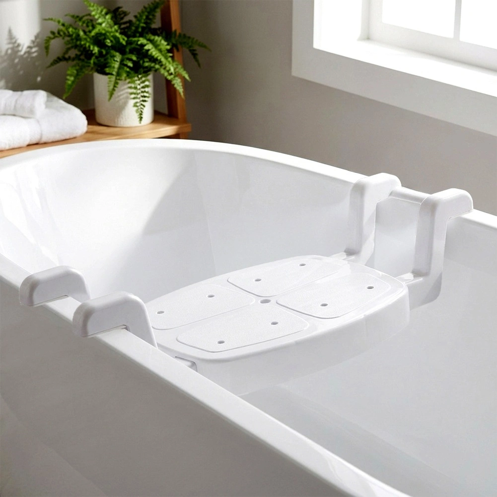 Ergonomicky tvarovaná sedacia plocha s rozmerom 35,5 × 27,5 cm s perforáciou na odtok vody minimalizuje riziko pošmyknutia a uľahčuje hygienu. Montáž je rýchla a bez náradia – sedadlo sa bezpečne opiera o okraje vane a poskytuje istotu pri presadaní aj pri samotnom kúpaní.