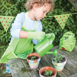 Krhla s pevnou hubicou a hornou aj bočnou rukoväťou sa dobre drží malým ručkám a umožňuje presné zalievanie bez rozliatia. Elastické zápästia rukavíc bránia vniknutiu nečistôt a držia rukavice bezpečne na mieste. Sada sa skladá z 6 dielov a je perfektným darčekom pre deti od 3 rokov.