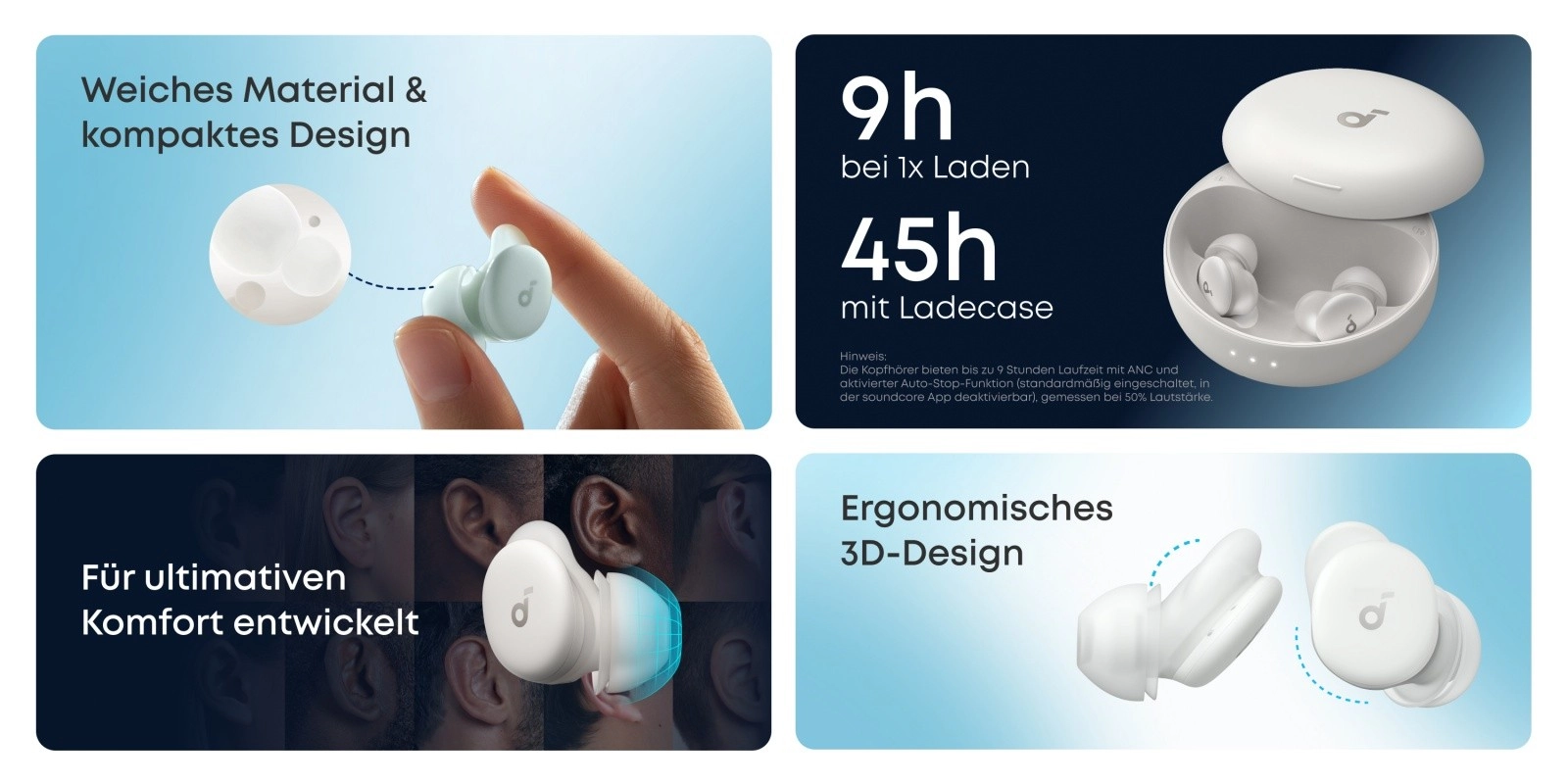Pre maximálne pohodlie pri spánku na boku majú slúchadlá ultra mäkké silikónové nadstavce, krátke trysky a ľahké, nízkoprofilové telo, ktoré minimalizuje tlak. Ergonomický tvar vychádza z mapovania tisícov zvukovodov, takže padne väčšine používateľov. Nabíjacie puzdro navyše monitoruje a analyzuje chrápanie a slúchadlá priebežne optimalizujú maskovacie zvuky, aby vás partnerovo chrápanie nerušilo.