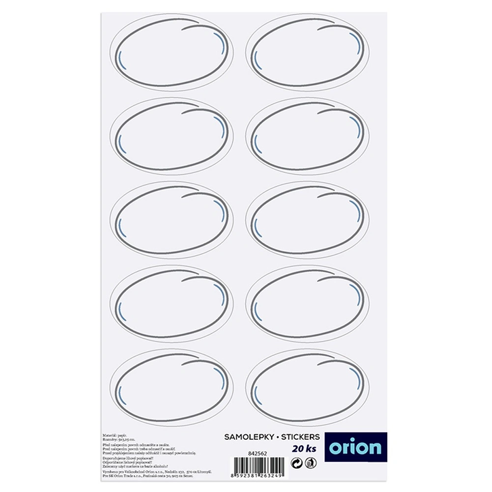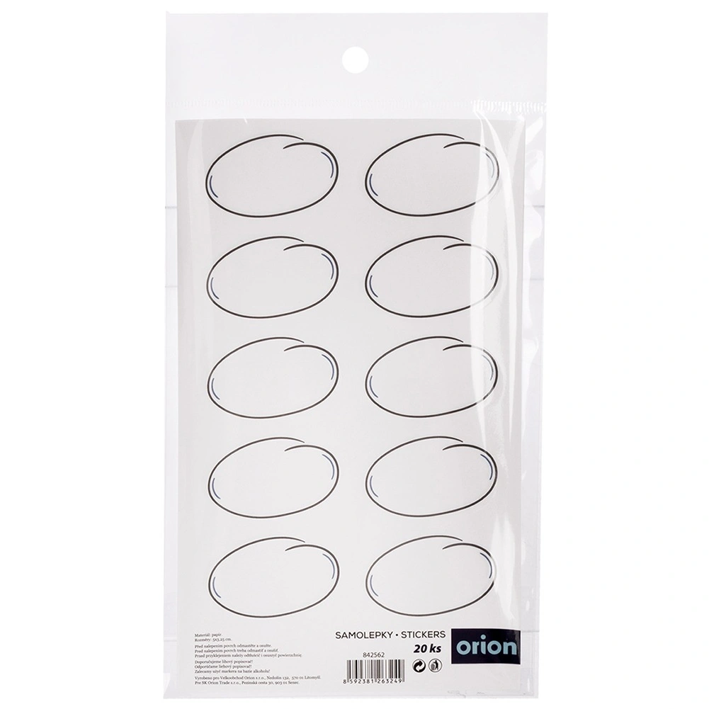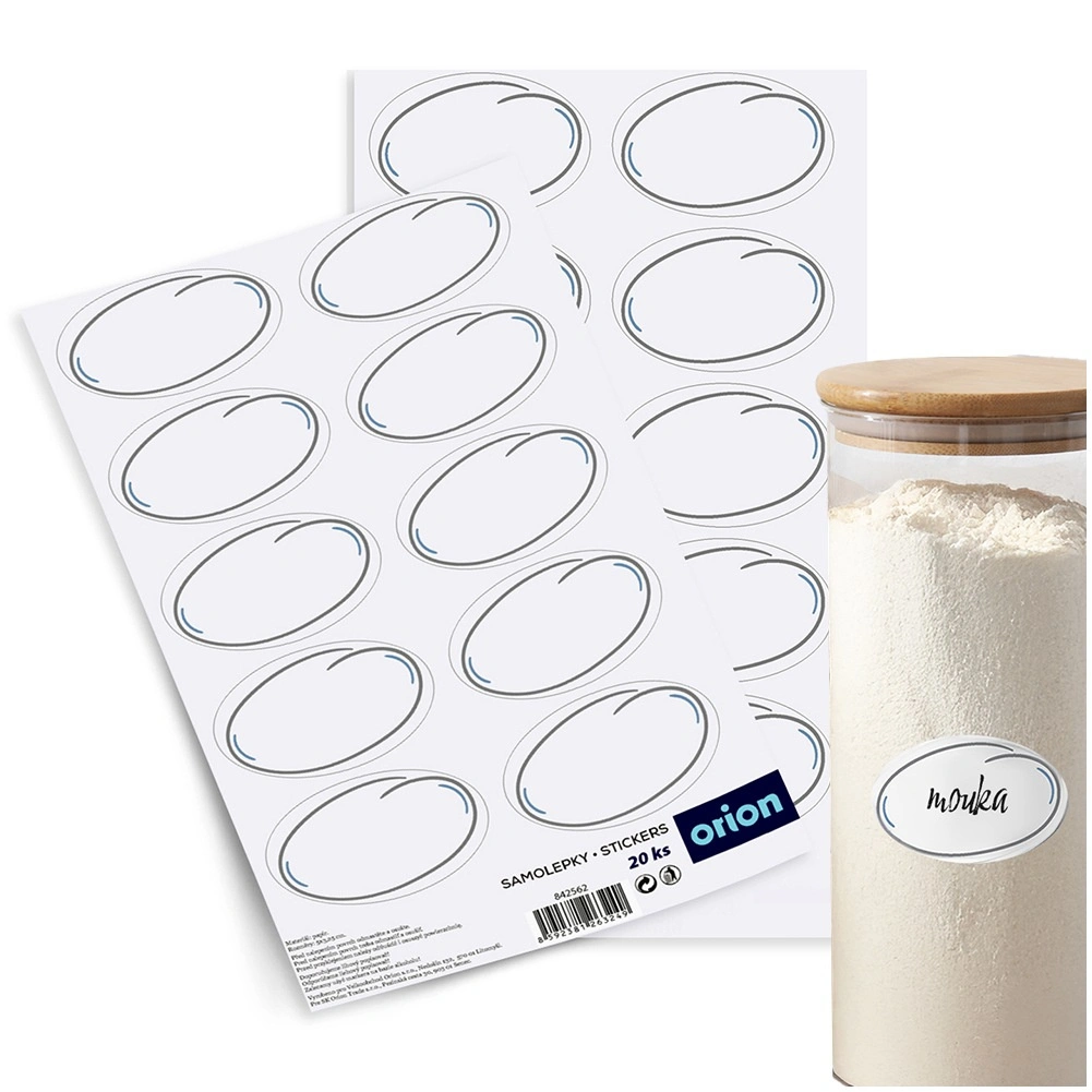 Praktická sada 20 samolepiacich etikiet s rozmerom 5 × 3 cm na prehľadné označenie pohárov, fliaš aj dóz. Bielé, laminované etikety majú čistý a čitateľný vzhľad, ľahko sa lepia bez potreby ďalšieho lepidla a pomáhajú s organizáciou kuchyne a špajze. Originálny produkt značky ORION vyrobený podľa európskych štandardov.