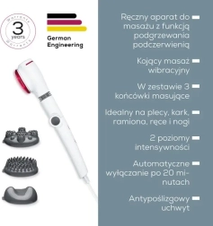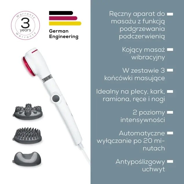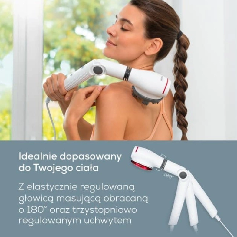 Vďaka veľkej masážnej a hrejivej ploche a otočnej hlavici v rozsahu 180° sa ľahko dostanete aj na ťažšie dostupné miesta. Tri kvalitné masážne nadstavce umožňujú prispôsobiť masáž vašim potrebám – od plošnej po bodovú.