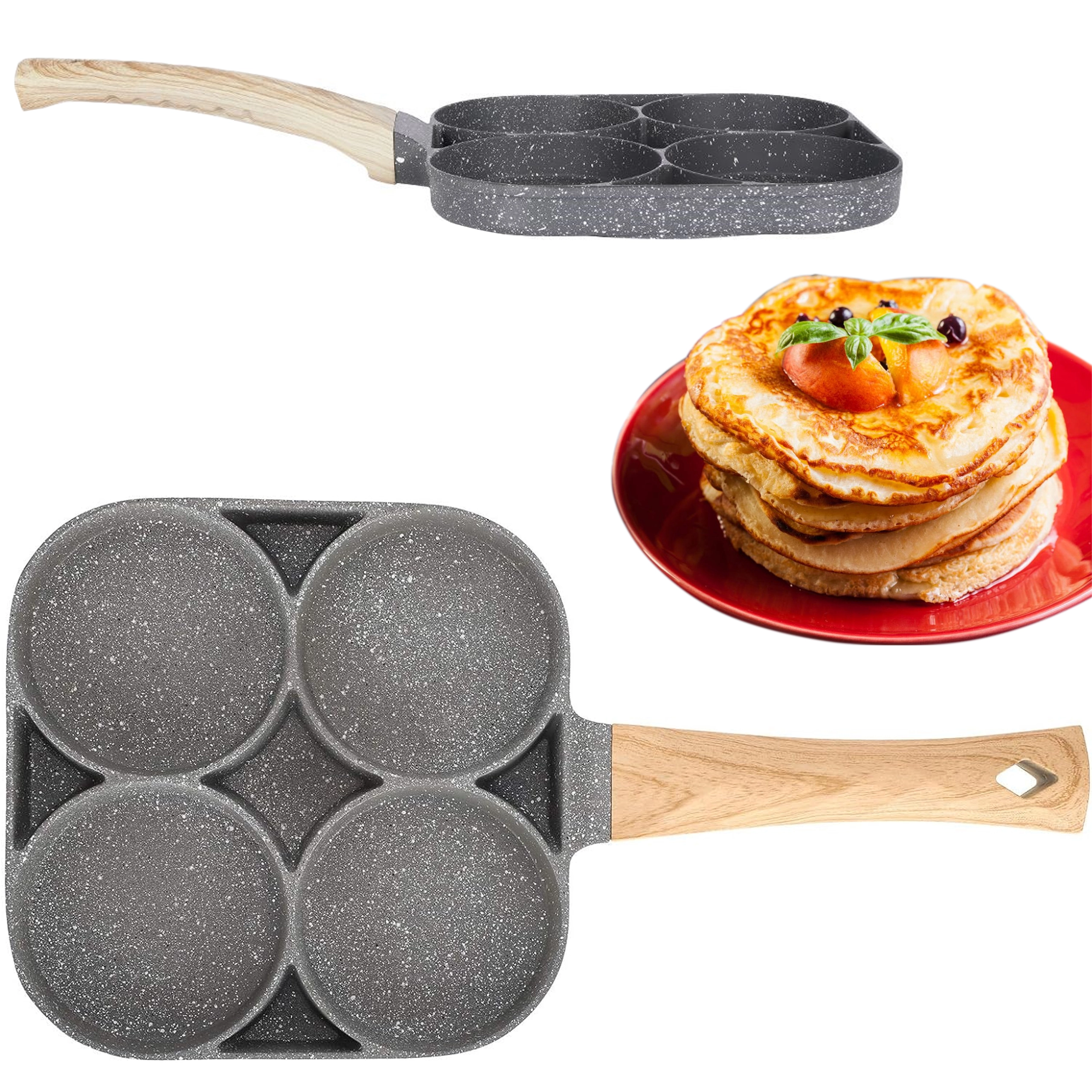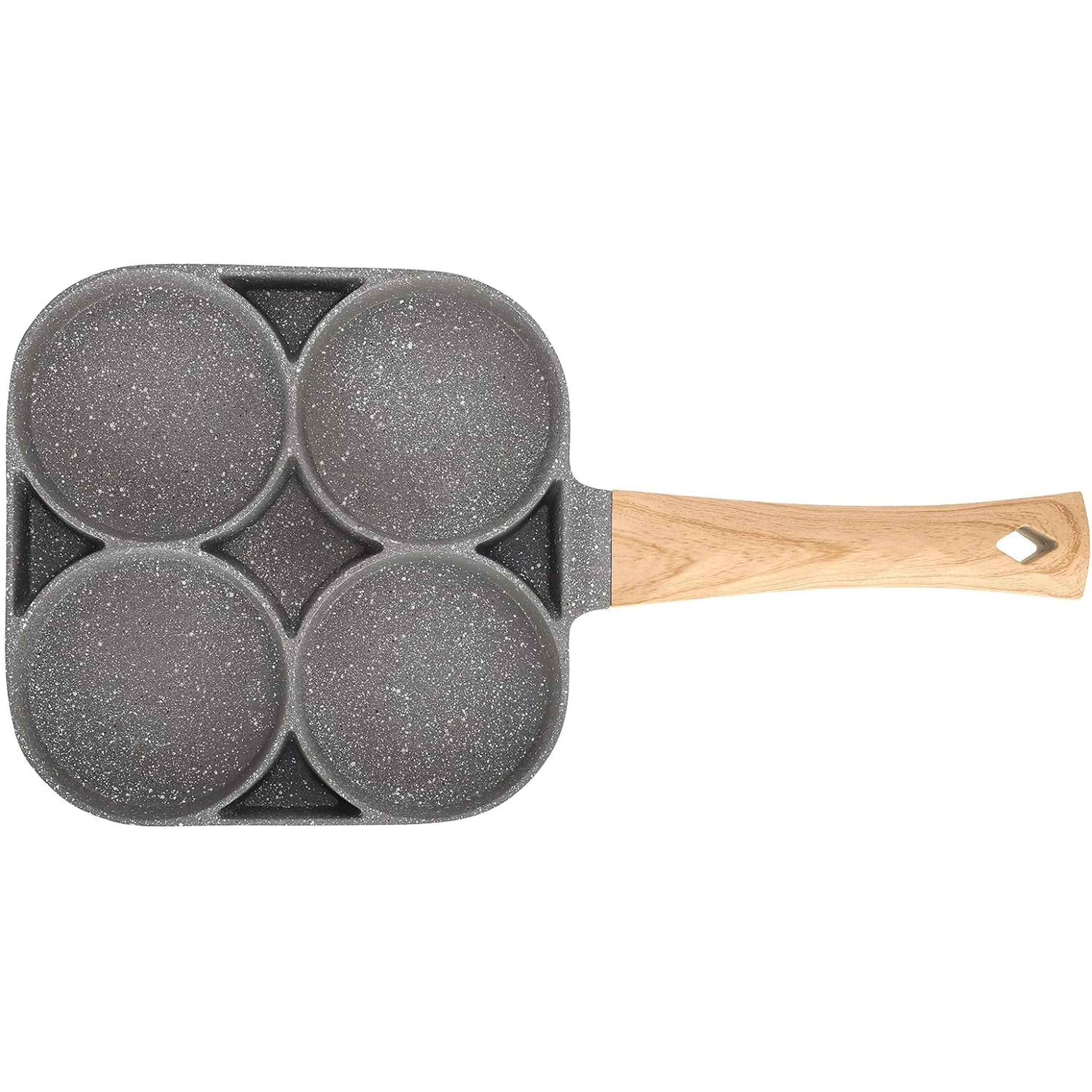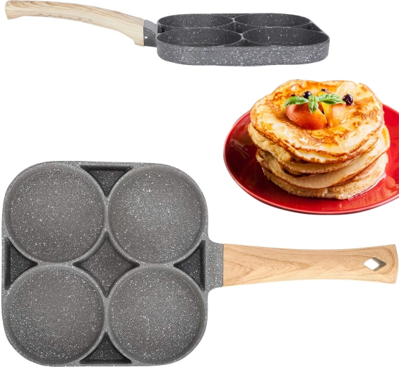 Pripravte si raňajky rýchlejšie a bez neporiadku s touto univerzálnou panvicou so štyrmi okrúhlymi komorami. Vďaka nepriľnavému povrchu a rovnomernému rozvodu tepla pripravíte vajcia, lievance, placky aj mini palacinky dokonale tvarované a súčasne. Ergonomická rukoväť s dreveným vzhľadom sa príjemne drží a panvica je vhodná na indukciu, plyn aj ďalšie typy sporákov.