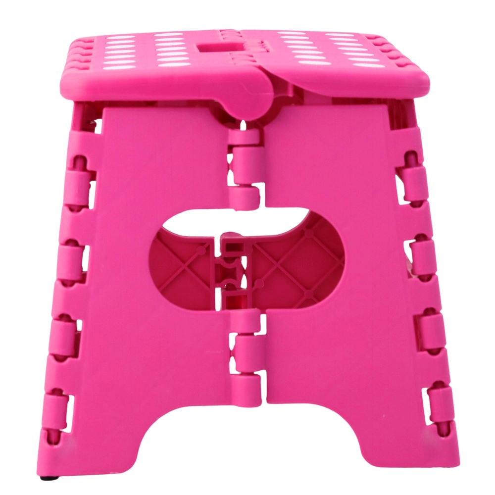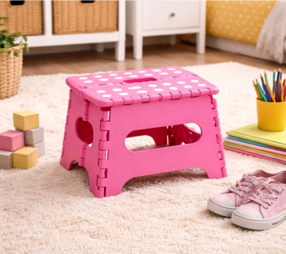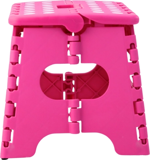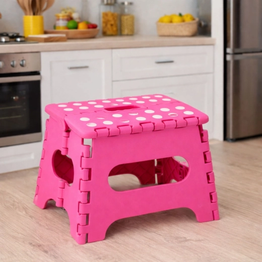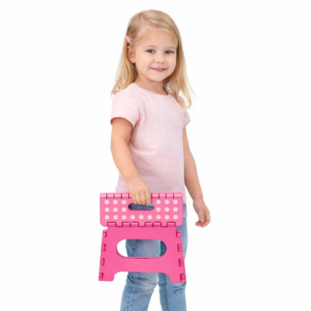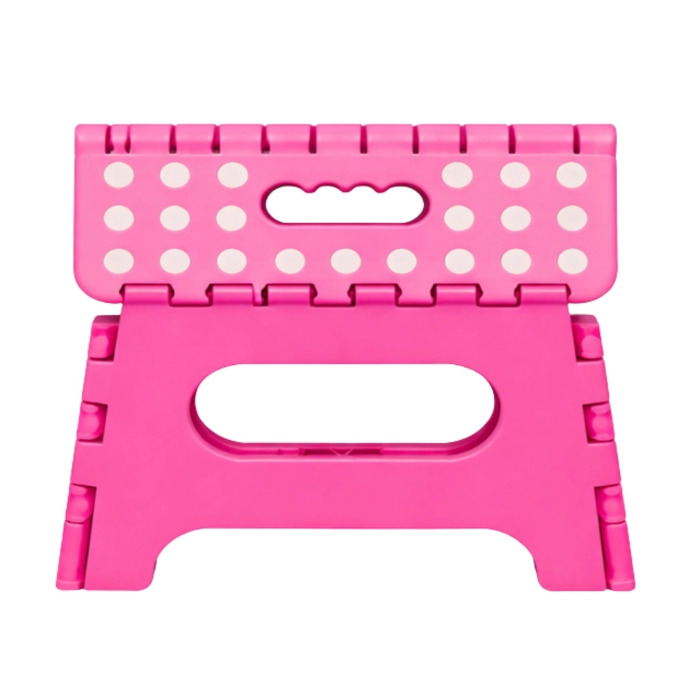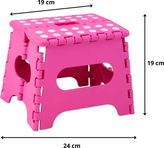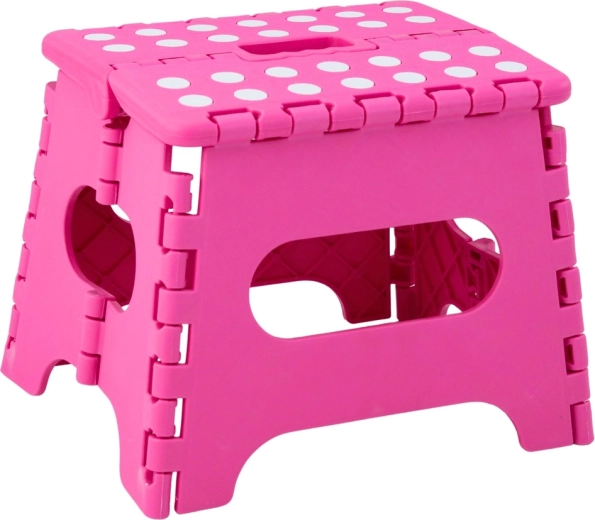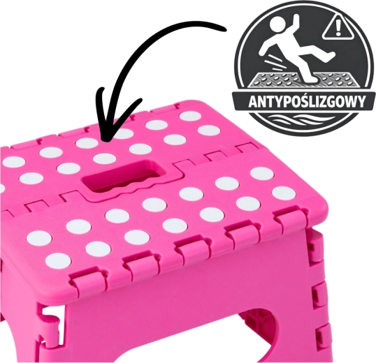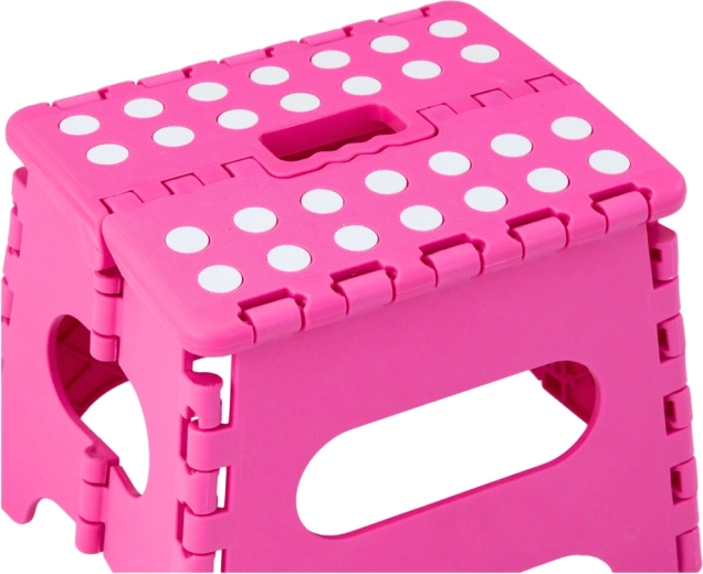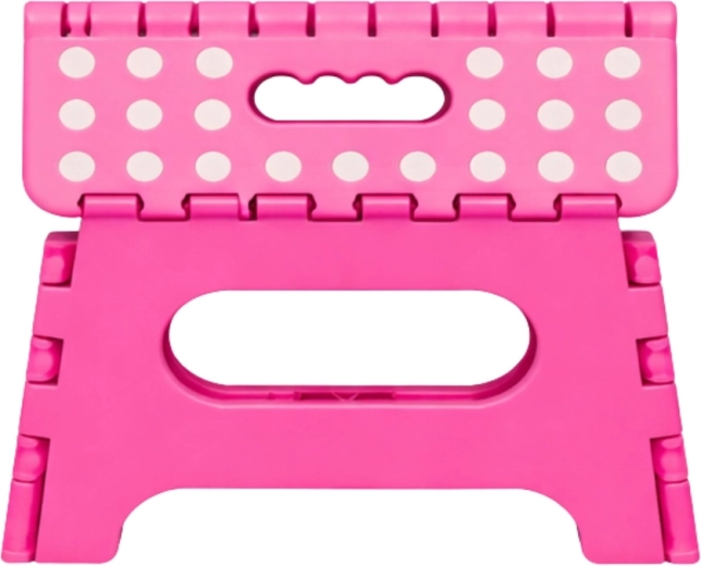 Ružový skladací schodík je vyrobený z odolného plastu, ktorý zabezpečuje pevnosť a dlhú životnosť. Protišmyková vrchná plocha s bodkami zvyšuje bezpečnosť pri používaní, a to aj vo vlhkom prostredí. Integrované madlo umožňuje rýchle prenášanie i jednoduché zloženie do plochého tvaru na úsporné skladovanie.