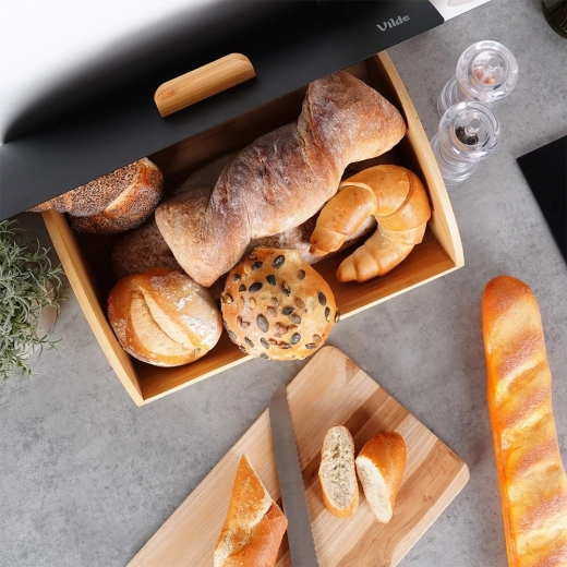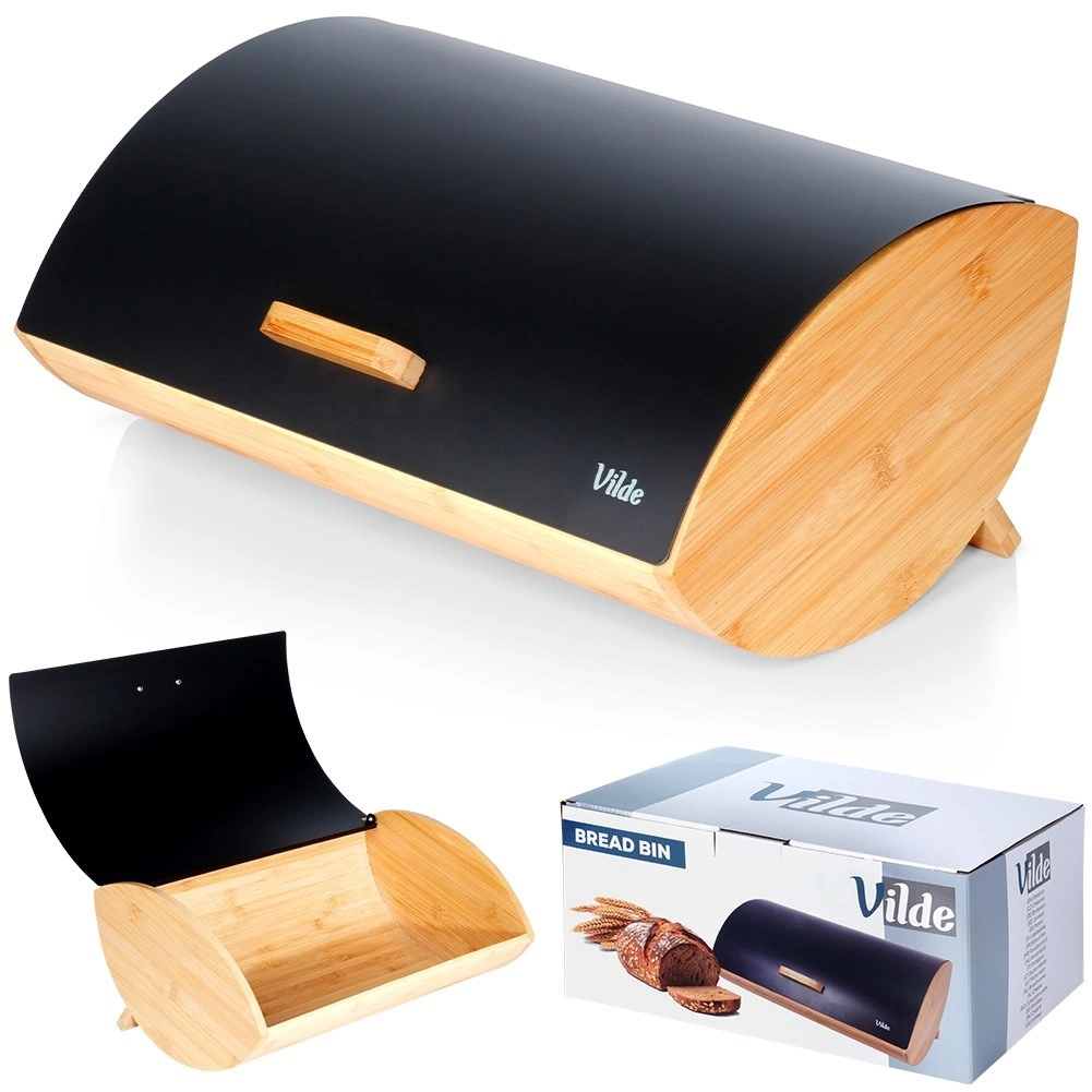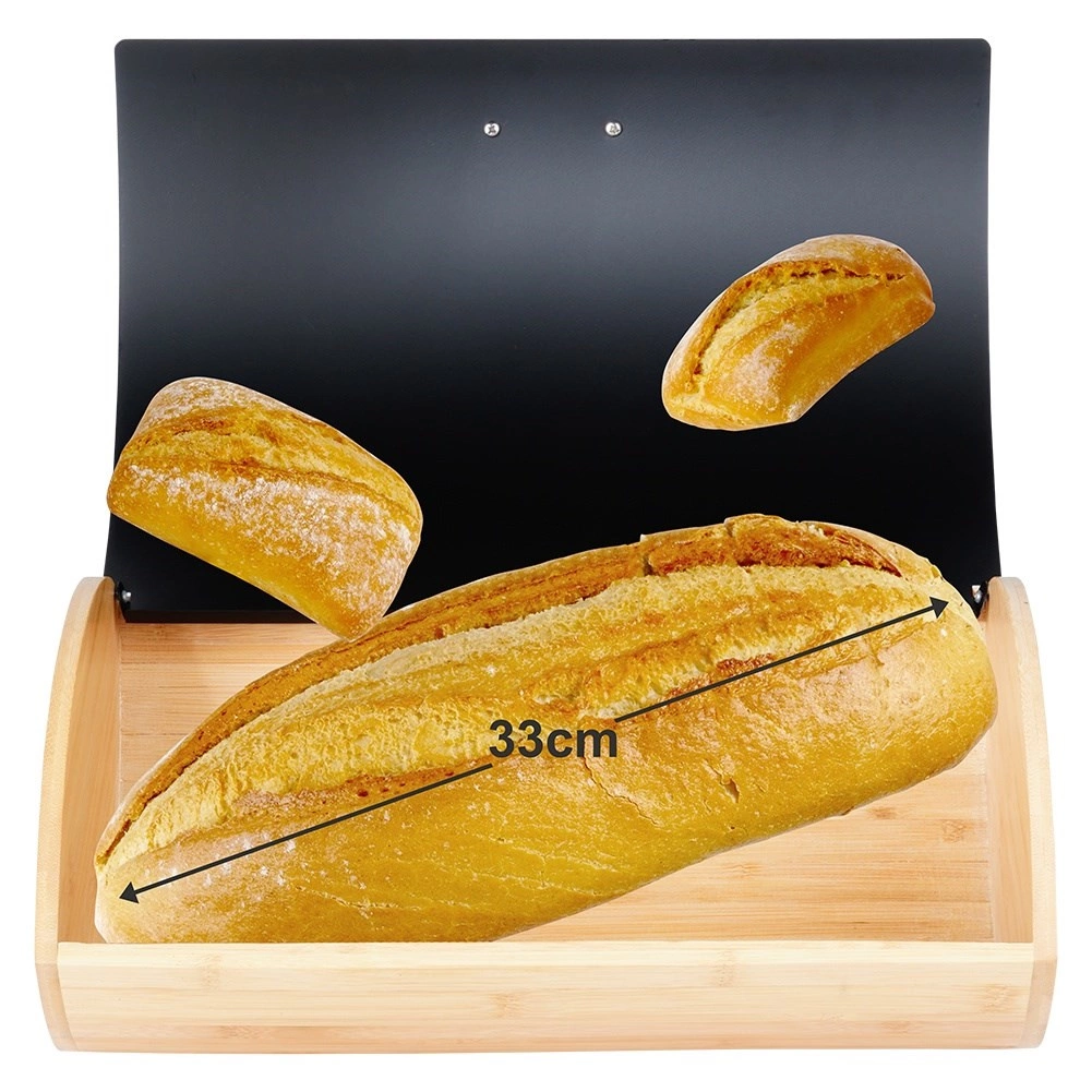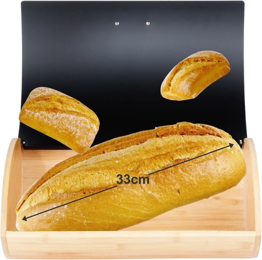 Praktický a štýlový chlebník s rozmermi 35,5 × 24,5 × 15,5 cm je ideálny na každodenné uchovávanie chleba, rožkov aj sladkého pečiva. Bambusové telo je ľahké a pevné, zatiaľ čo veko z práškovo lakovaného kovu v matnej čiernej farbe pôsobí moderne a odolá každodennému používaniu.