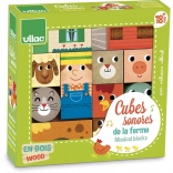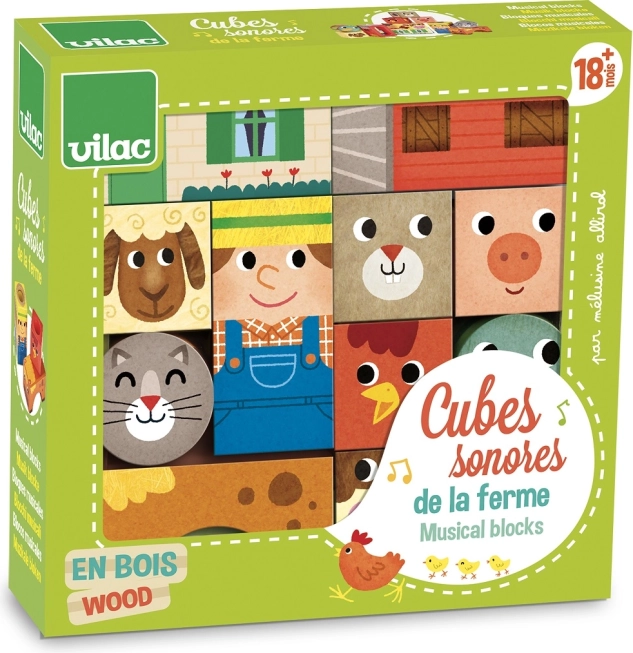 Vilac Drevené zvukové kocky Farma sú zábavné a vzdelávacie hračky, ktoré pomáhajú deťom rozvíjať motorické zručnosti a objavovať rôzne zvuky.