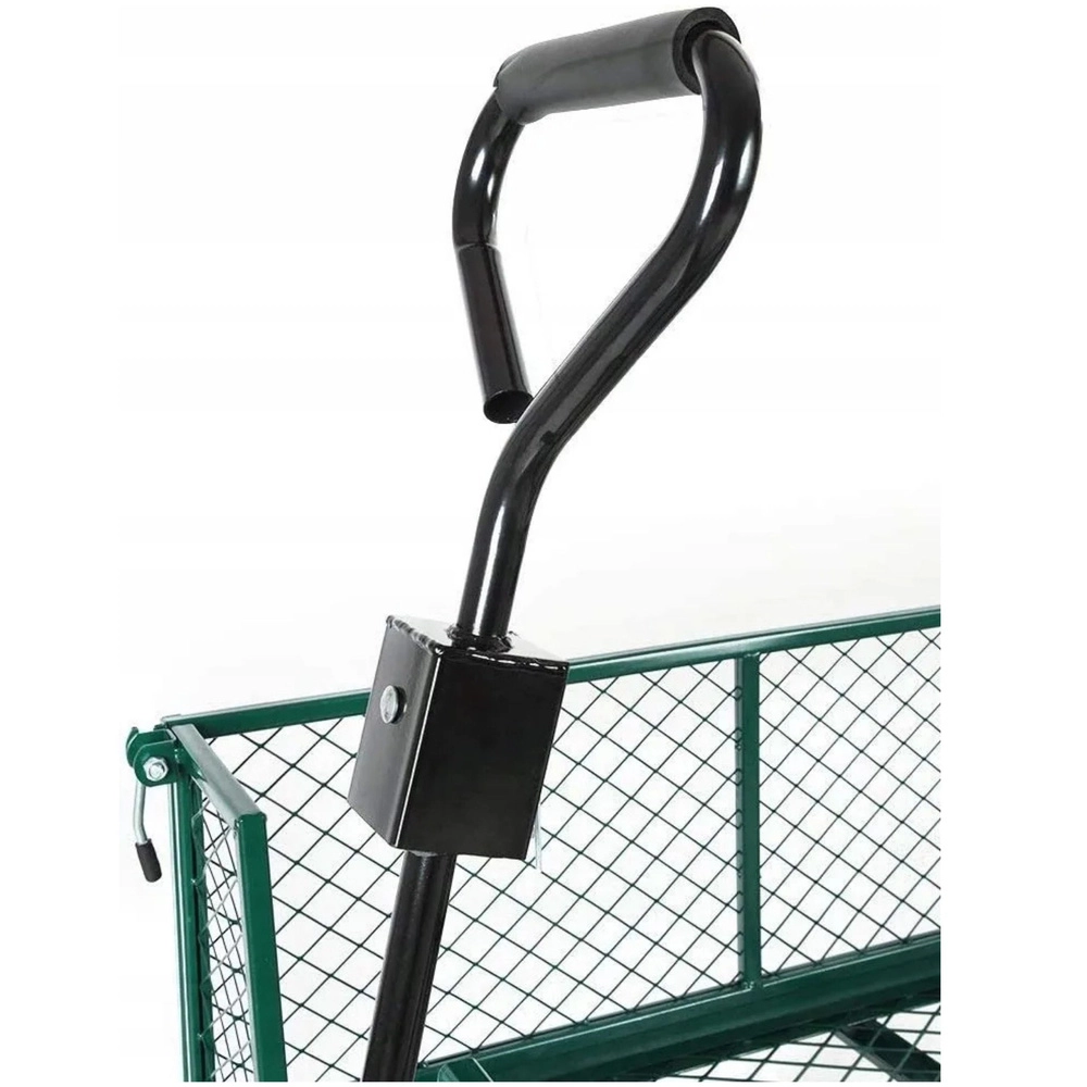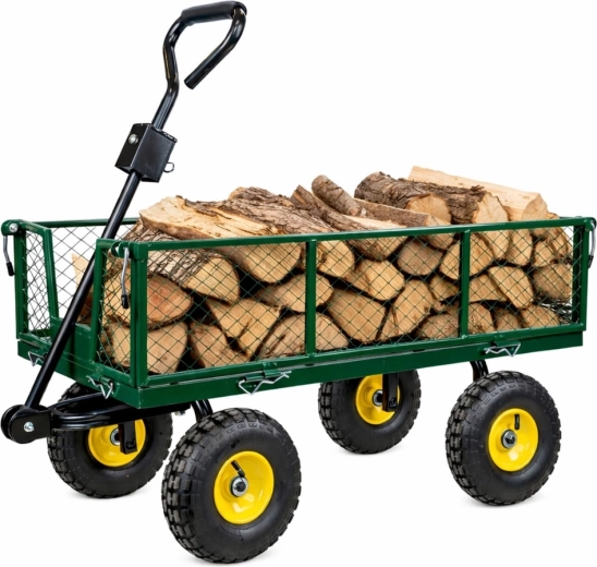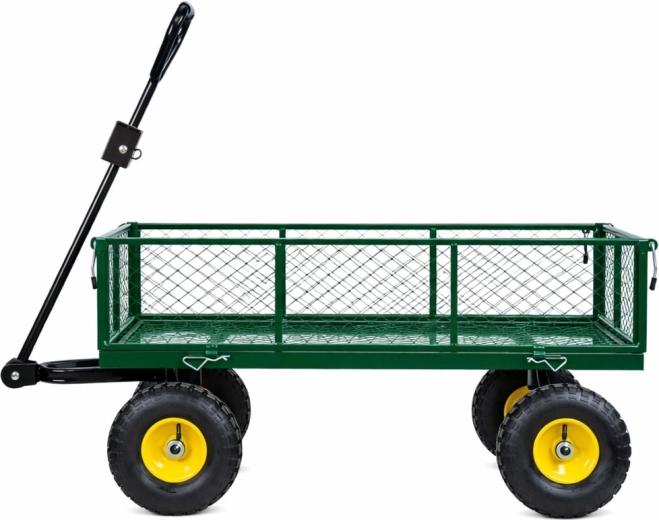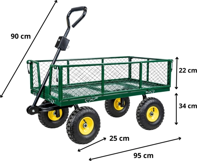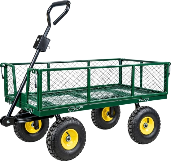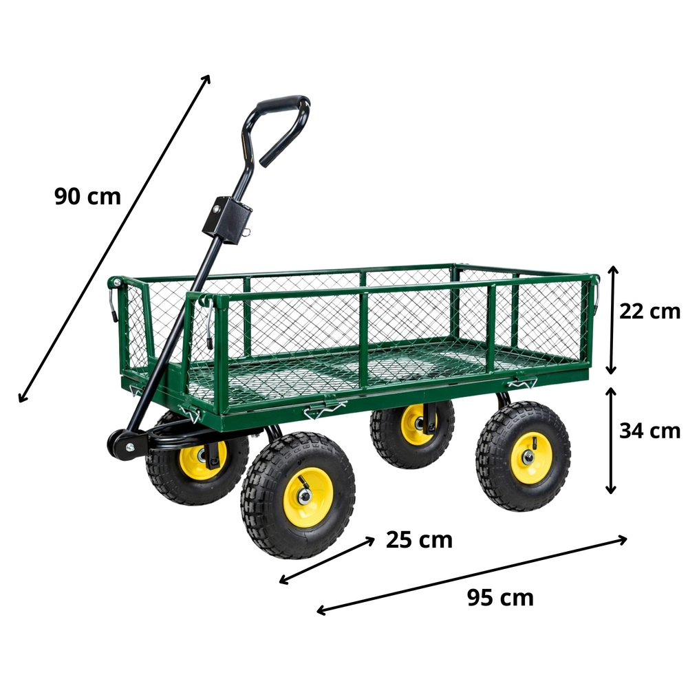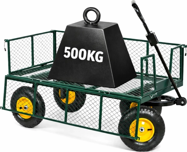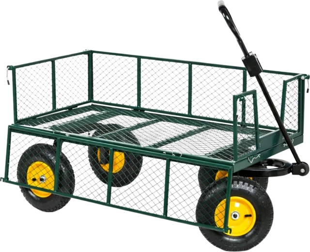 Robustný záhradný vozík z odolnej ocele na ľahký prevoz materiálu na záhrade, stavbe aj v sklade. Ponúka nosnosť až 200 kg, 4 nafukovacie kolesá pre hladkú jazdu v teréne, otočnú prednú nápravu na presné manévrovanie a sklopné bočnice pre rýchle nakladanie a vykladanie.