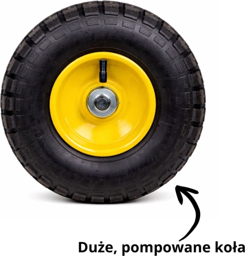 Štyri veľké pneumatikové kolesá s oceľovými diskami zaisťujú stabilitu, trakciu a pohodlné vedenie vozíka na tráve, štrku aj dlažbe.