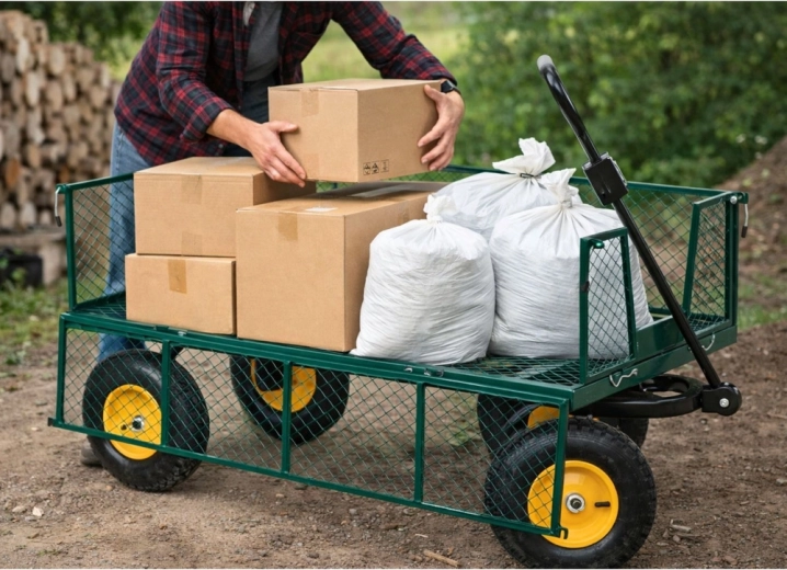 Vďaka sklopným a odnímateľným bočniciam je nakladanie rýchle a bezpečné, zatiaľ čo ergonomická rukoväť s mäkkou penou zvyšuje komfort pri dlhšej práci. Po skončení možno vozík rýchlo zložiť a ľahko uložiť aj v menších priestoroch.