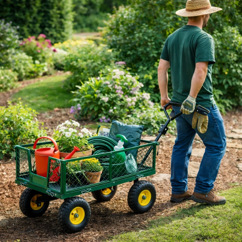 Hľadáte univerzálneho pomocníka pri práci na záhrade, stavbe či v dielni? Tento oceľový záhradný vozík s nosnosťou 200 kg zvládne zeminu, drevo, kamene aj náradie. Stabilná štvorkolová konštrukcia s nafukovacími kolesami tlmí nerovnosti trávy, štrku i dlažby a otočná predná náprava zabezpečuje presné riadenie aj pri plnom zaťažení.