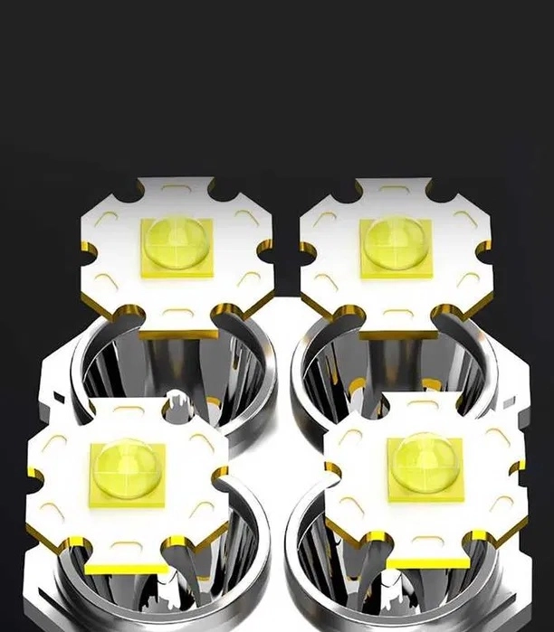 Hlavný kužeľ so 4× T6 LED poskytuje silný, smerovaný lúč až do 200 m. Bočný COB panel vytvára široké, príjemné pracovné svetlo bez oslnenia – ideálne na chôdzu, kemp či opravy.