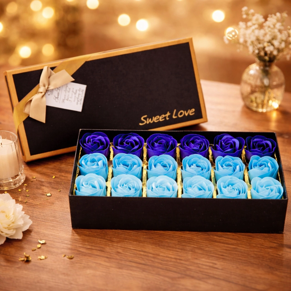 Elegantný flower box s kompozíciou voňavých dekoratívnych ruží v odtieňoch modrej je hotový darček aj štýlová výzdoba interiéru. Ruže verne napodobňujú skutočné kvety, nevyžadujú zálievku ani starostlivosť a dlhodobo si udržia svoj estetický vzhľad aj jemnú vôňu. Vďaka luxusnému darčekovému baleniu je ideálny na narodeniny, výročie, meniny aj na Valentína či Deň žien.