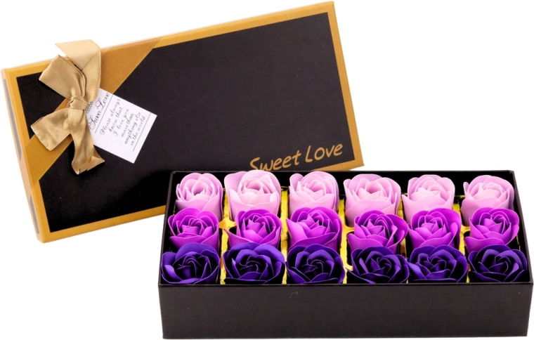Súprava 18 ruží v plynulom prechode od svetloružovej po sýtofialovú vytvára harmonickú kompozíciu.