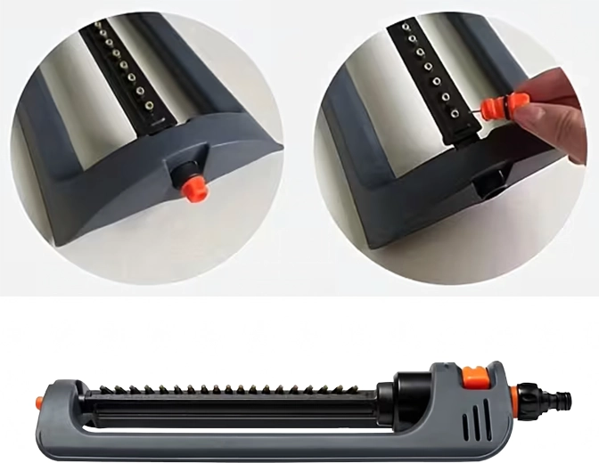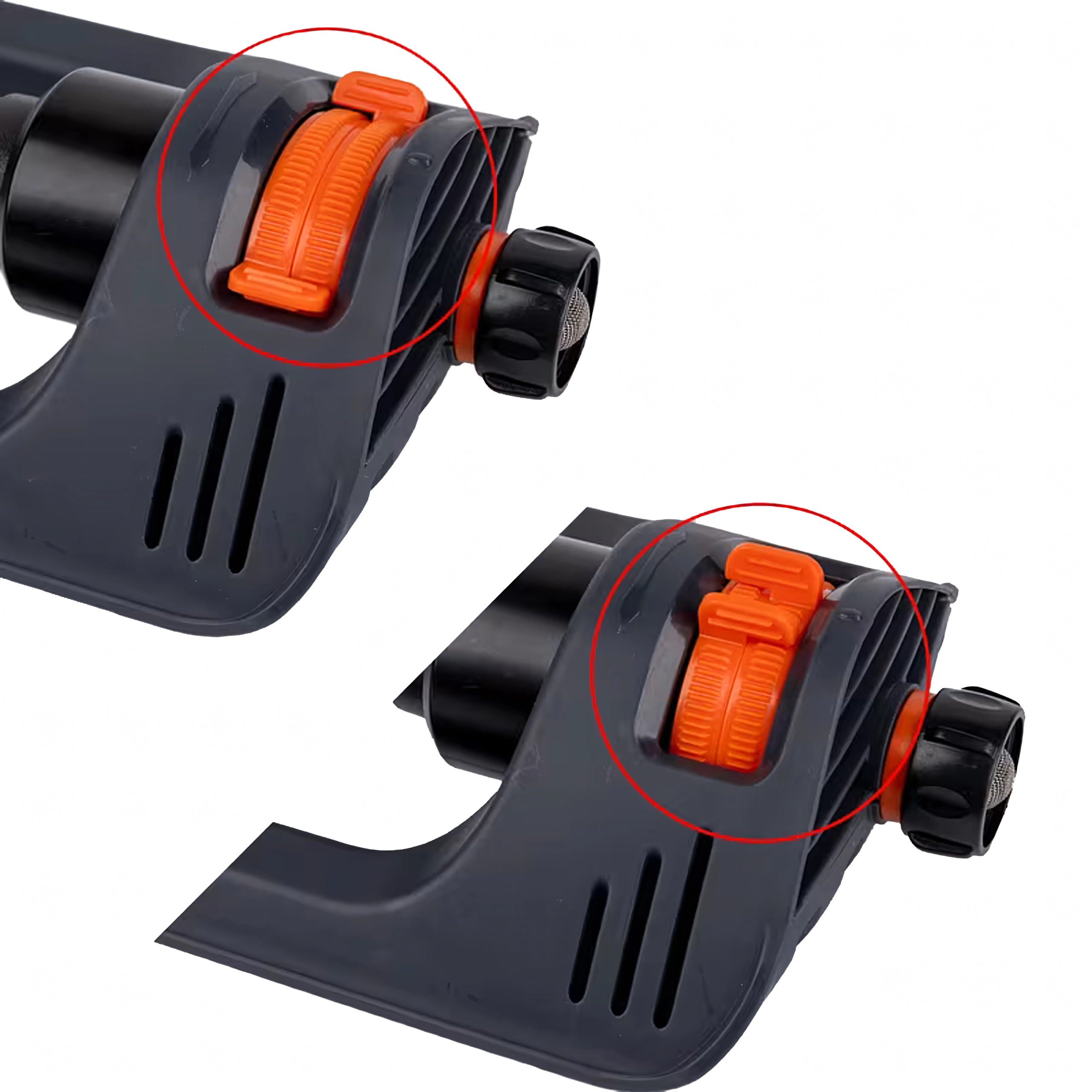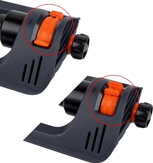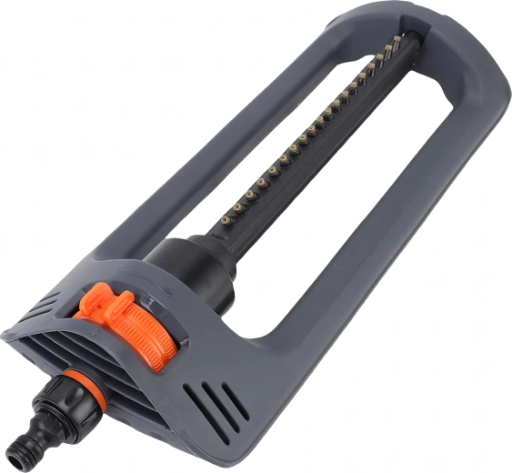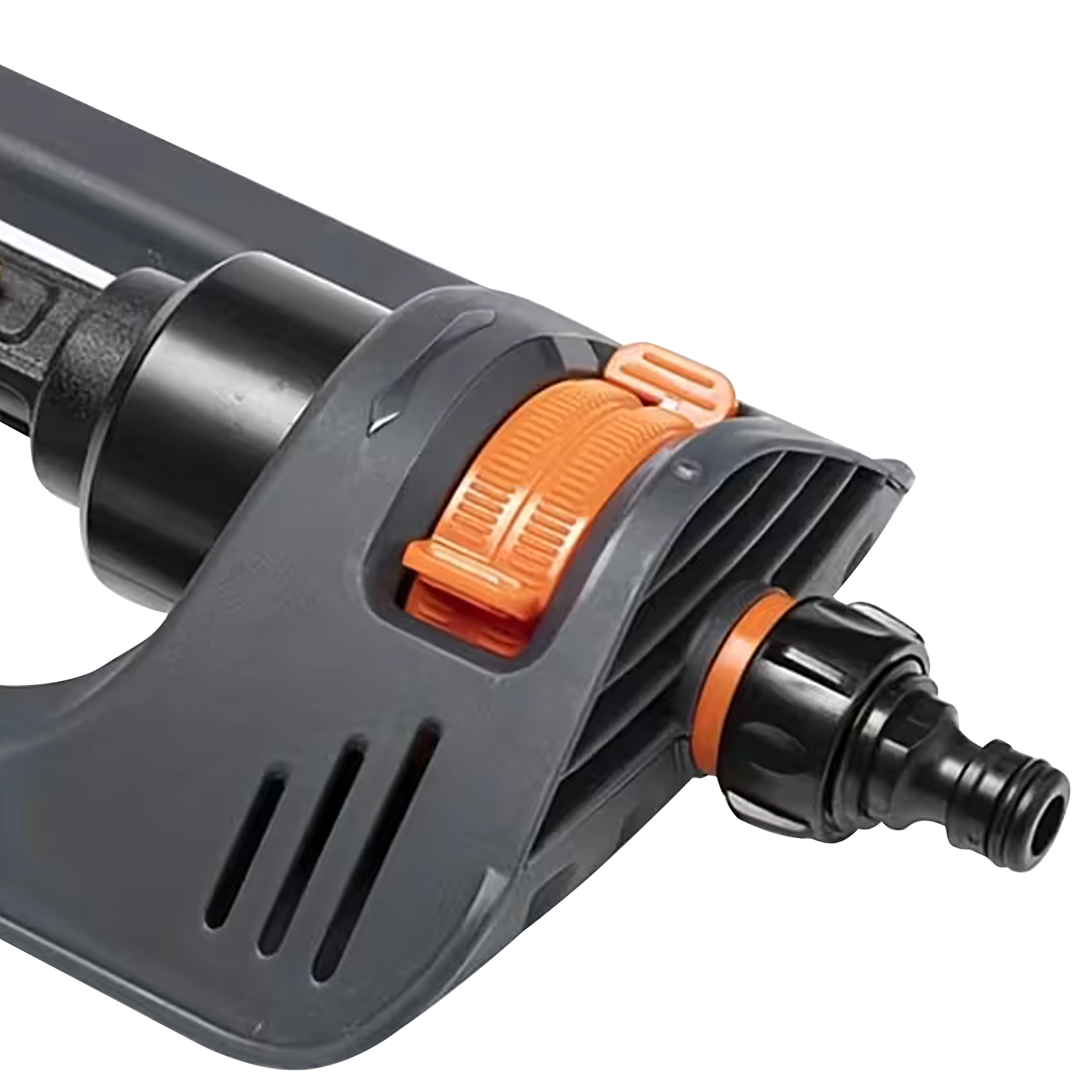 Odolná konštrukcia so stabilným nízkoprofilovým rámom drží postrekovač pevne na mieste, zatiaľ čo rýchlospojka uľahčí pripojenie ku štandardnej záhradnej hadici. Ovládacie prvky vo výraznej farbe zaručujú rýchle a intuitívne nastavenie prietoku aj šírky postreku.