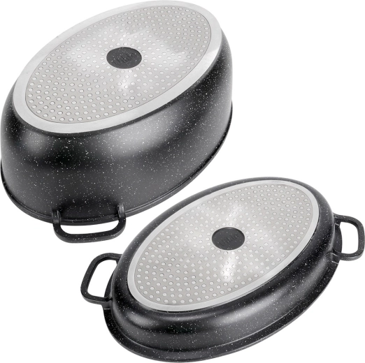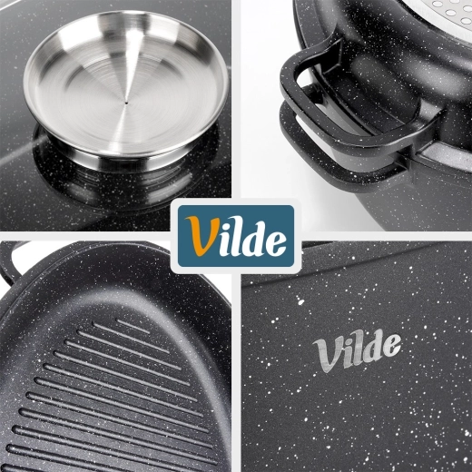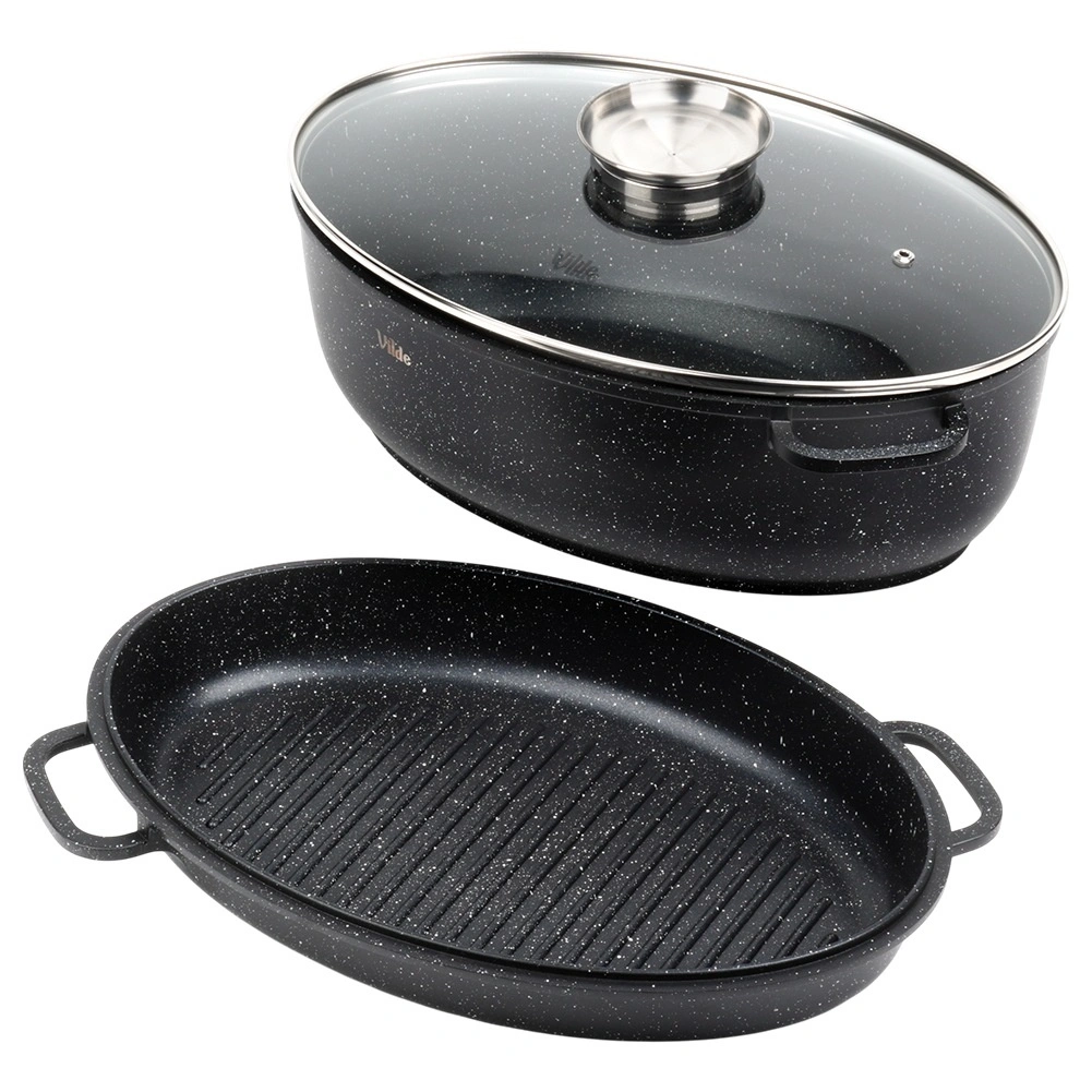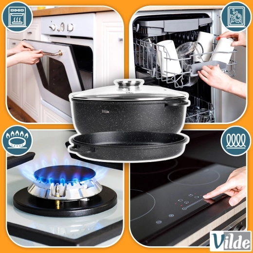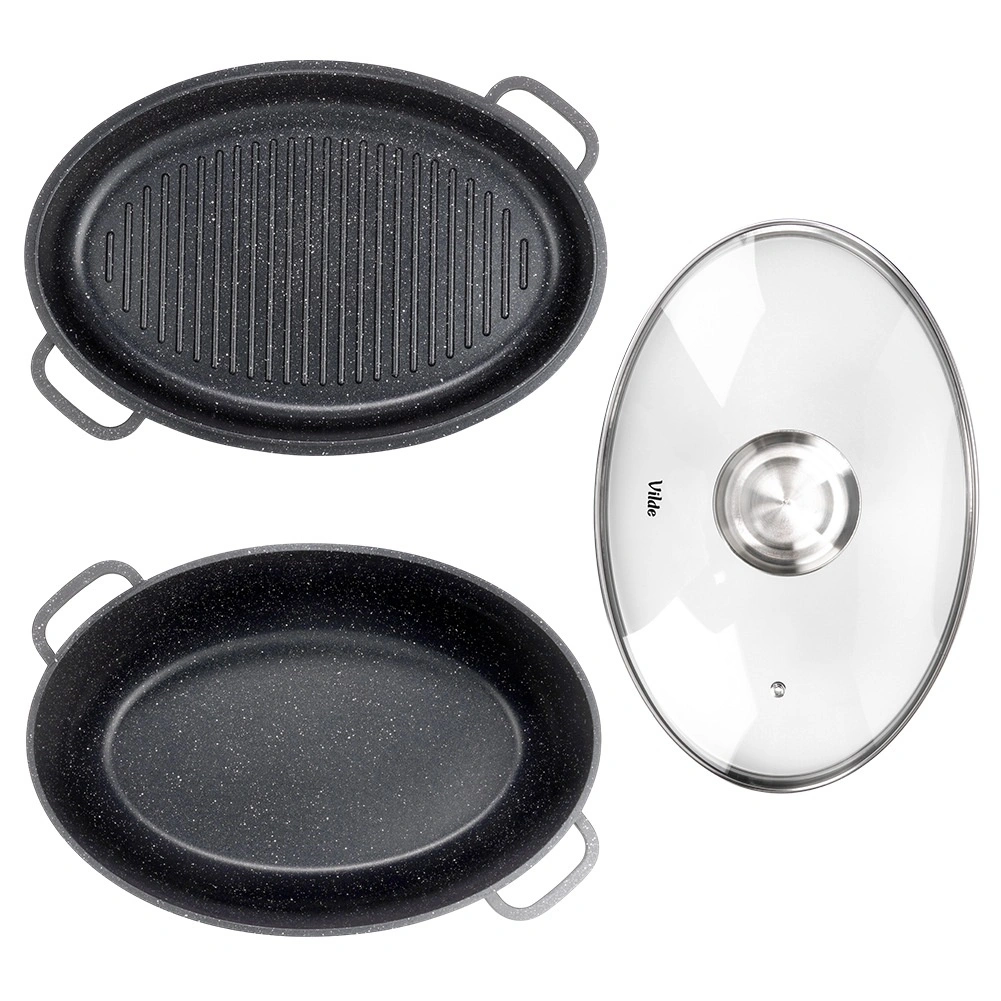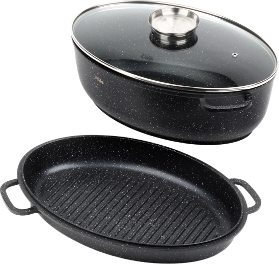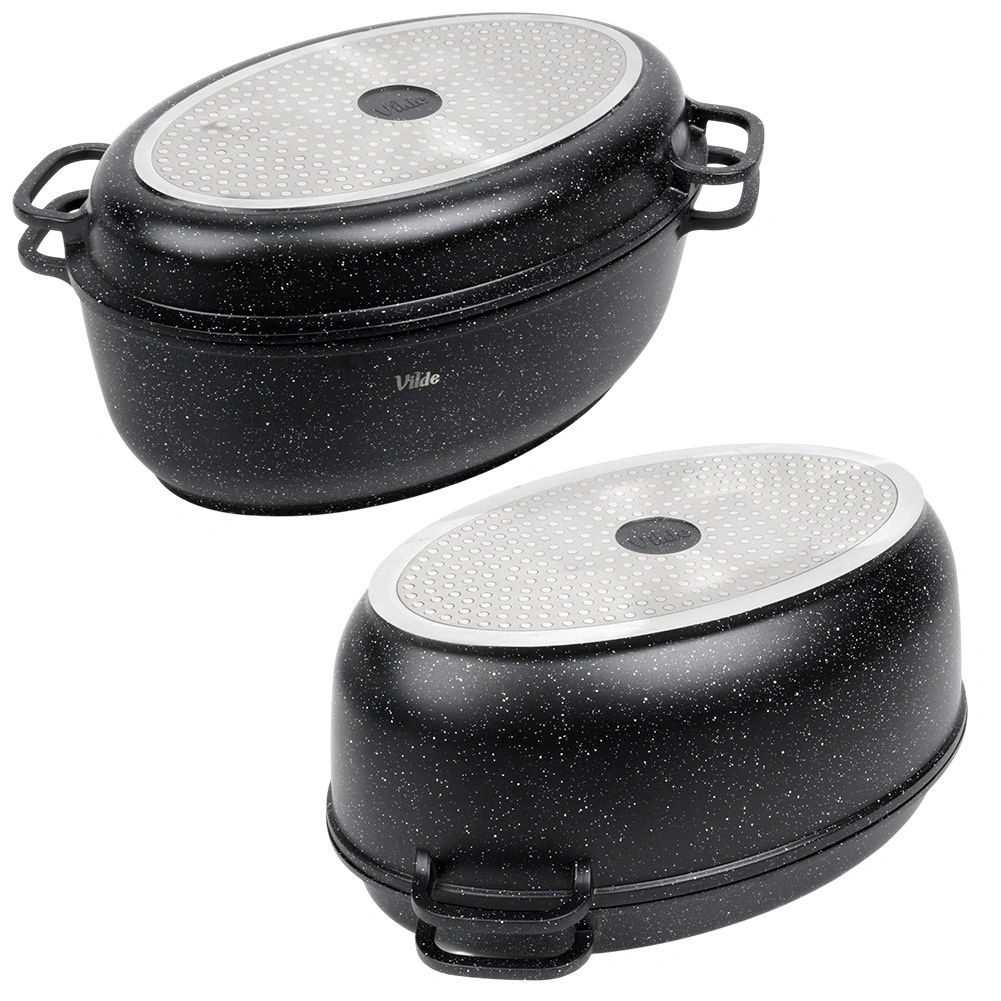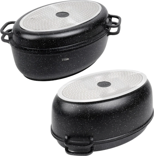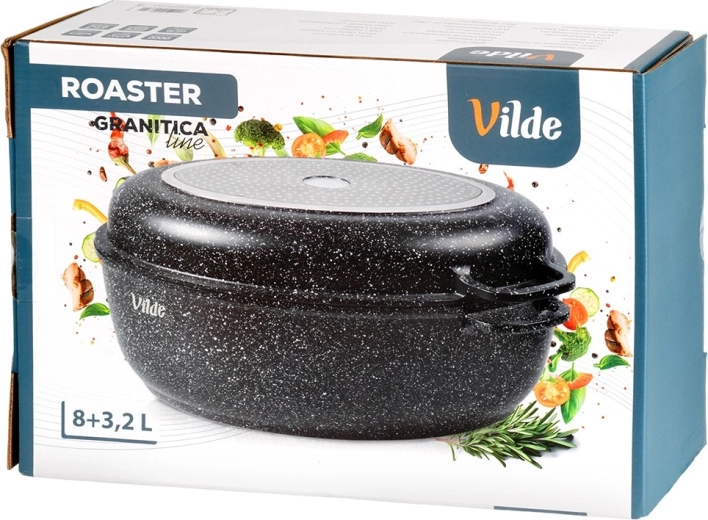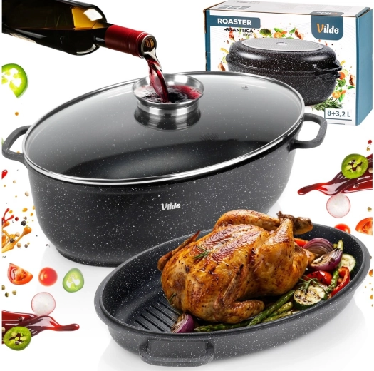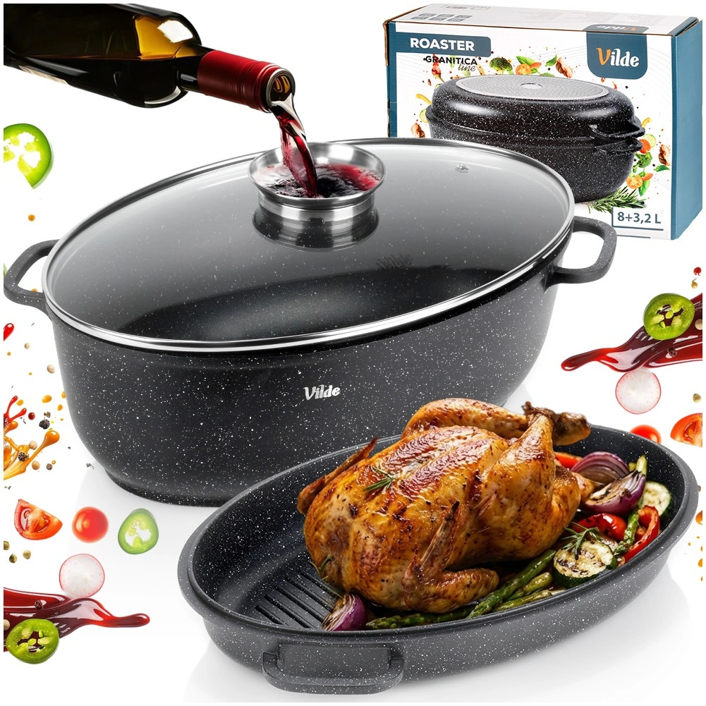 Univerzálny oválny pekáč 3v1 od značky Vilde z radu Granitica kombinuje hlboký pekáč 8 l, pokrievku z žiaruvzdorného skla a panvicu–gril 3,2 l. Ideálny na pečenie, dusenie aj grilovanie s minimom tuku vďaka nepriľnavému granitovému povrchu. Vhodný na indukciu, do rúry aj do umývačky, so sklenenou pokrievkou s dávkovačom tekutého korenia na ľahké podlievanie bez zdvíhania veka.