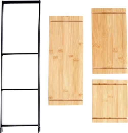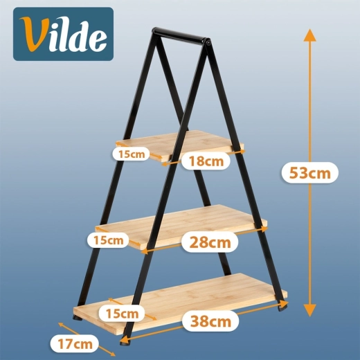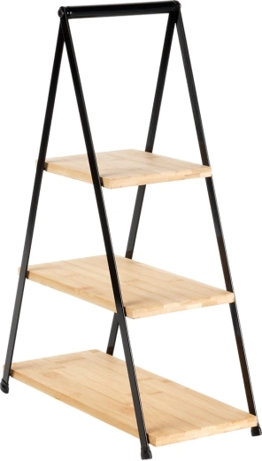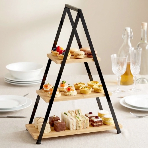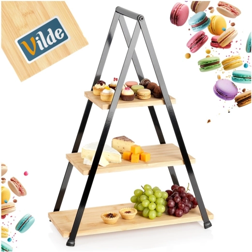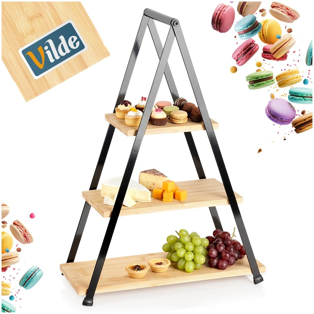 Elegantná trojposchodová etažéra s výškou 53 cm je ideálna na servírovanie a vystavenie dezertov, ovocia, kanapiek a predkrmov. Kombinácia prírodného bambusového dreva a pevného kovového rámu v čiernej farbe zaručuje stabilitu, odolnosť a štýlový vzhľad na každom stole. Vďaka skladacej konštrukcii sa ľahko prenáša aj skladuje.