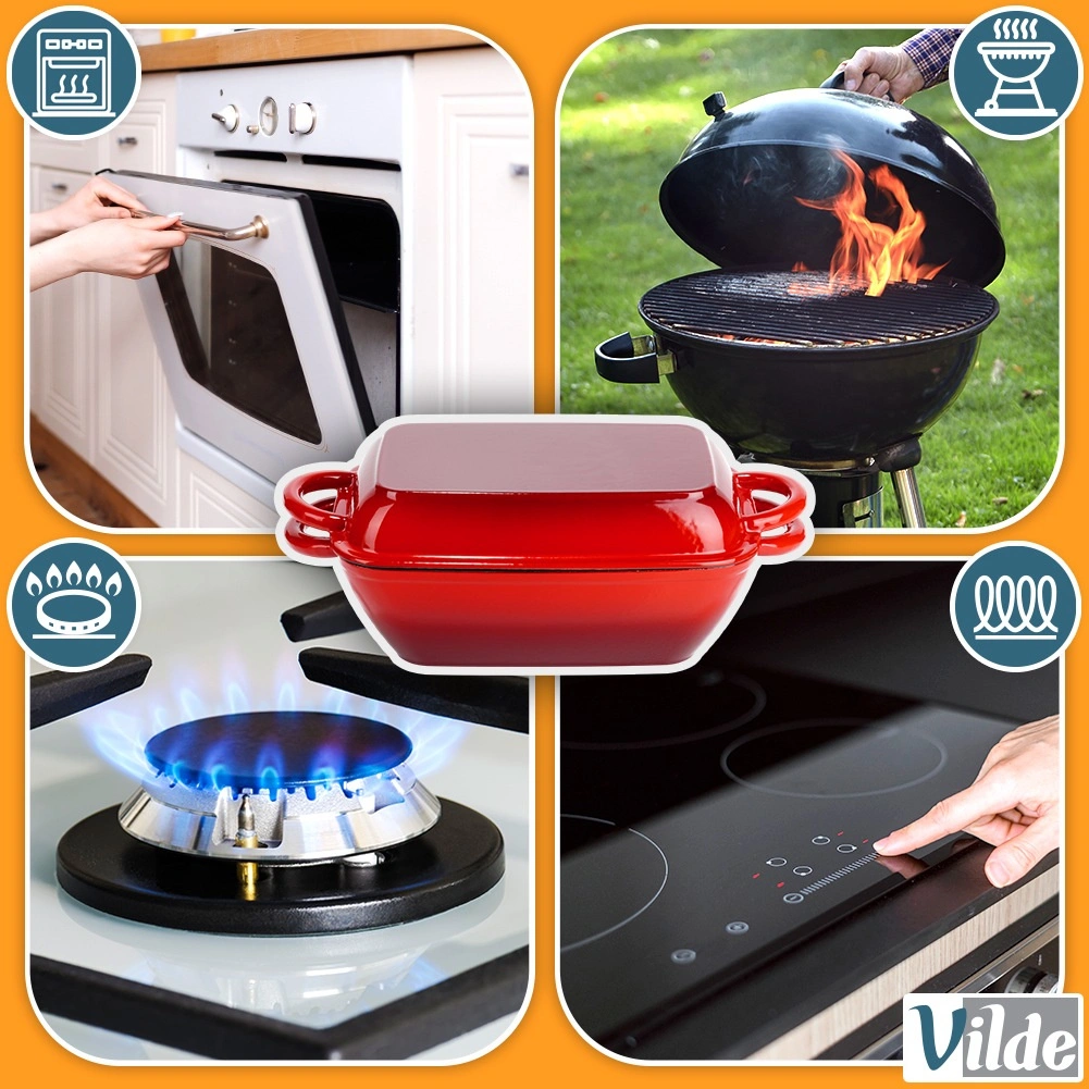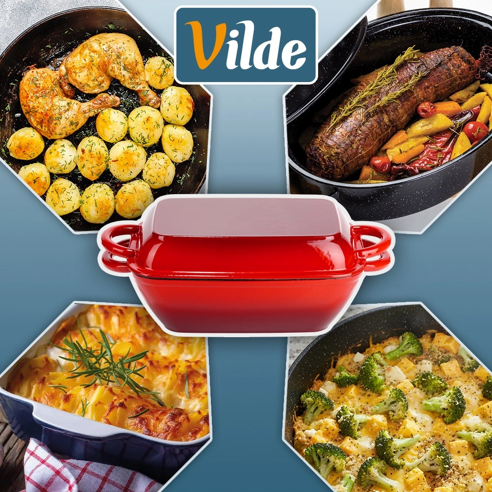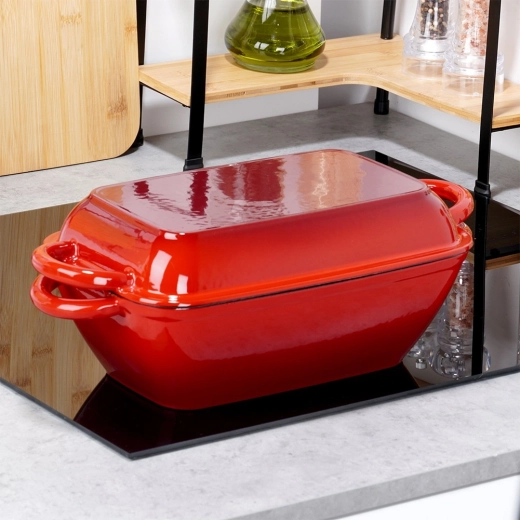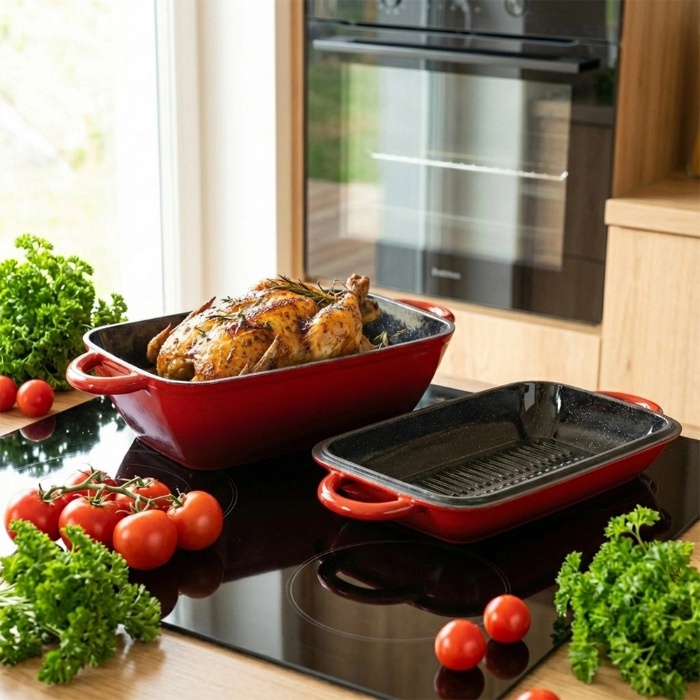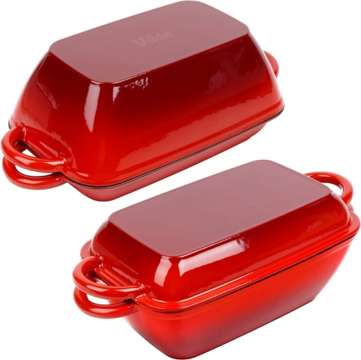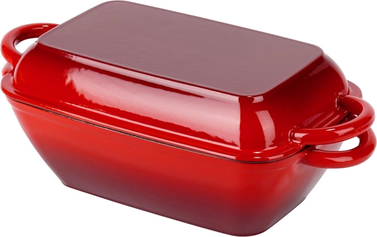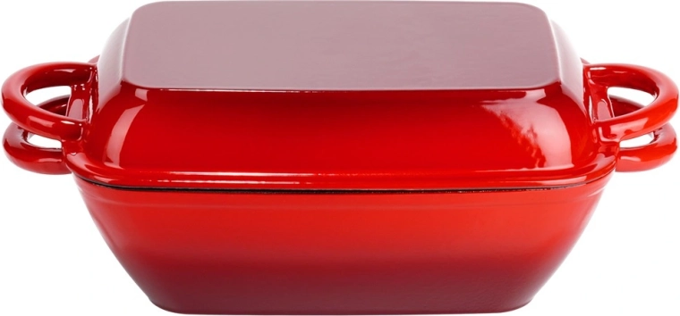 Univerzálna liatinová pekáčová sada 2v1 na pečenie, dusenie aj zapekanie. Veko slúži ako samostatná grilovacia panvica s ryhovaným dnom, samotný pekáč ponúka rovnomerné vedenie tepla a dlhé udržanie teploty. Odolné smaltované prevedenie, pohodlné bočné úchyty a použitie na všetkých typoch sporákov vrátane indukcie aj v rúre.