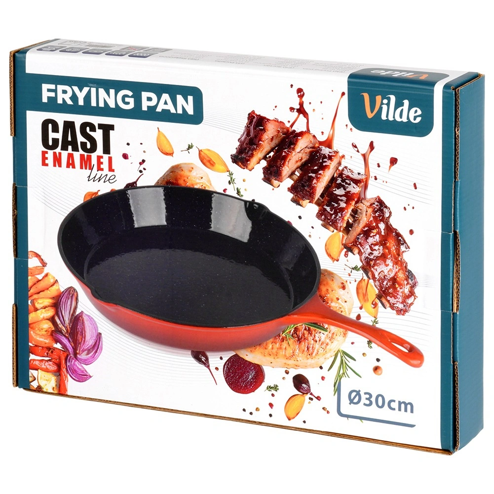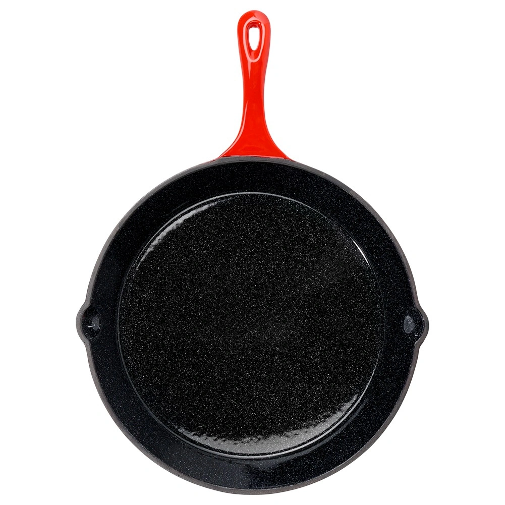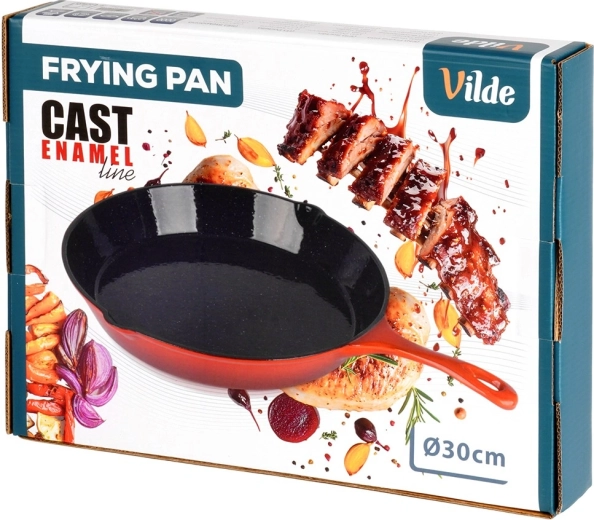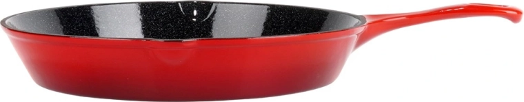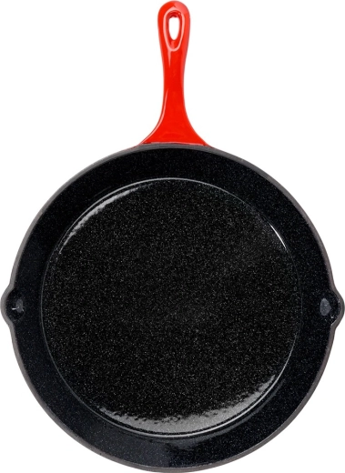 Robustná liatinová panvica 30 cm s čiernym smaltovaným vnútrom, dvoma výlevkami a červeným silikónovým návlekom na rukoväť pre bezpečné prenášanie. Skvelé vedenie a akumulácia tepla pre rovnomerné vyprážanie, dusenie aj zapekanie na sporáku, grile aj v rúre. Vhodná na plyn, elektrinu, sklokeramiku aj indukciu.