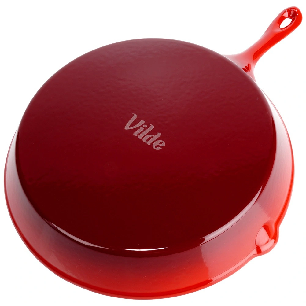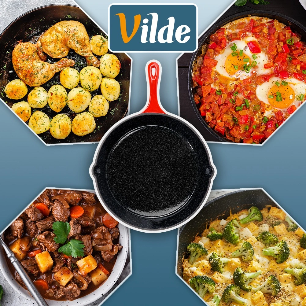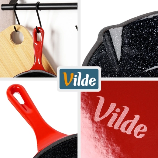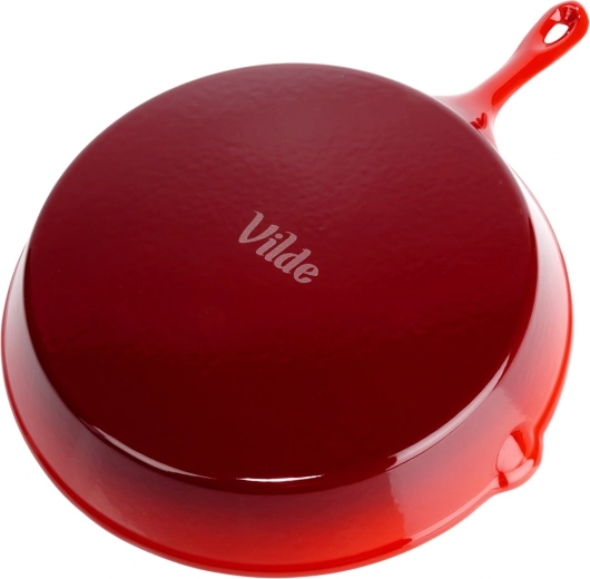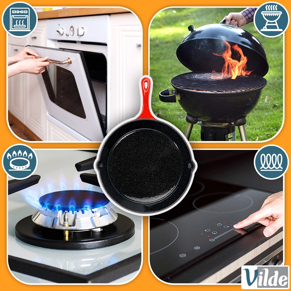 Súčasťou je silikónový návlek na rukoväť v červenej farbe pre bezpečné uchopenie horúcej panvice. Panvica je odolná voči vysokým teplotám a je ideálna na vyprážanie, dusenie, pečenie aj zapekanie – na sporáku, priamo nad ohňom, na grile aj v rúre. Očko na konci rukoväti umožní praktické zavesenie.