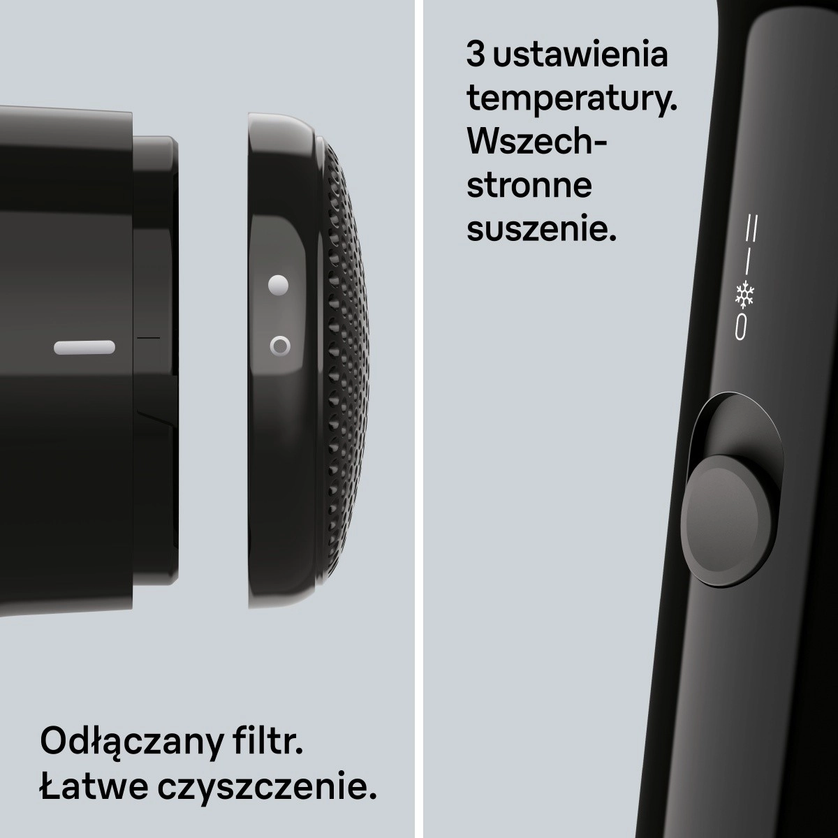 Ergonomická rukoväť a prehľadné ovládanie uľahčujú manipuláciu, viac stupňov prúdu vzduchu a teploty umožní prispôsobiť sušenie vášmu typu vlasov. Funkcia studeného vzduchu pomôže zafixovať finálny účes a dodať mu lesk.
