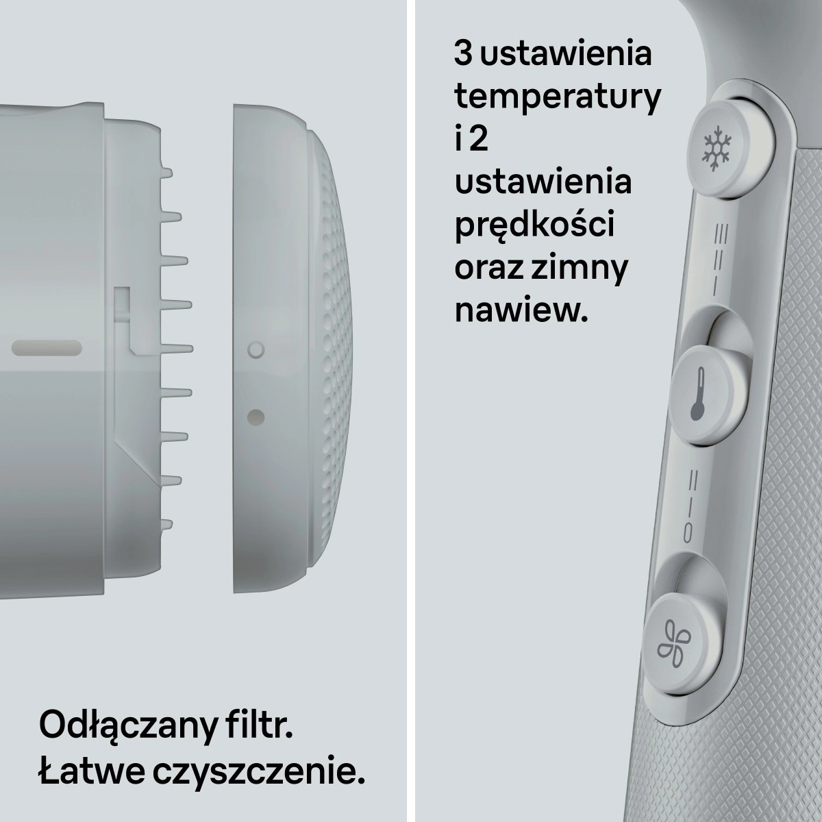Kompaktný ergonomický dizajn, viac stupňov teploty a rýchlosti a tlačidlo studeného vzduchu pre dokonalé nastavenie sušenia.