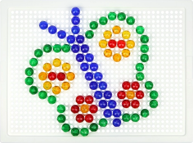 V balení nájdete pevnú plastovú mriežku s rozmermi 21 × 16 cm a 140 klobúčikov s priemerom 10 mm – akurát do detskej rúčky. Mozaika neobsahuje predlohy, a tak prirodzene podporuje voľnú kreativitu a samostatné vymýšľanie motívov.