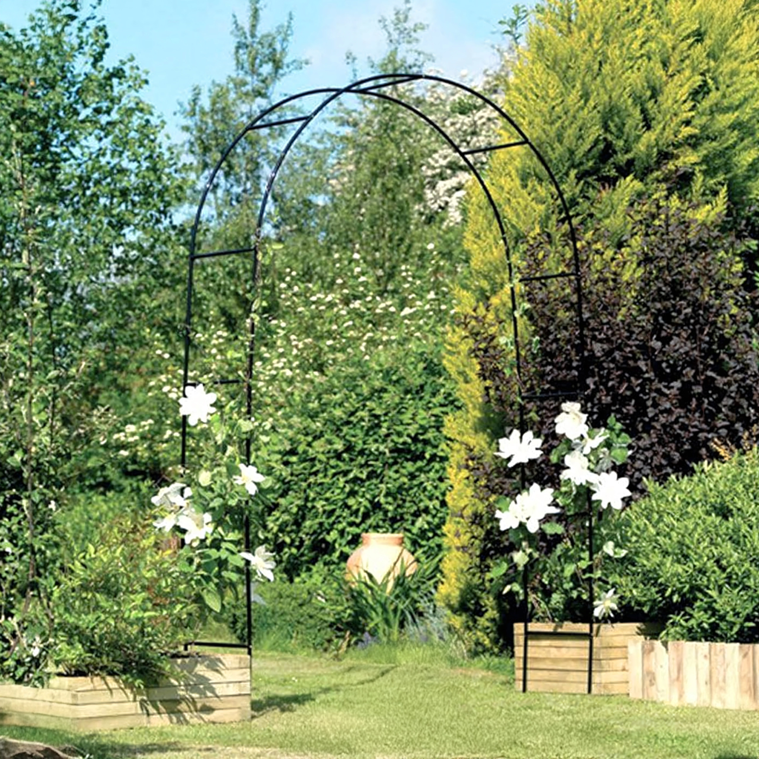 Vďaka modulárnemu systému rúr je zostavenie rýchle a intuitívne. Minimalistický čierny vzhľad sa hodí do moderných aj klasických záhrad, na svadby aj záhradné oslavy. Stačí zapustiť nohy do zeme alebo kvetináčov a nechať rastliny rásť do výšky.