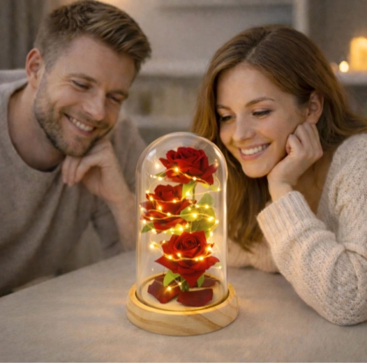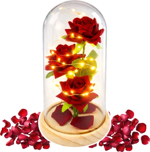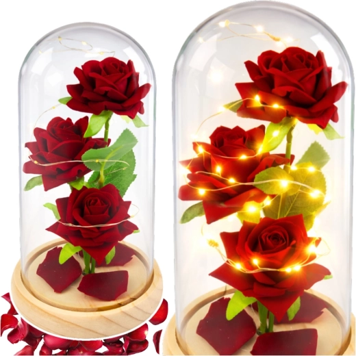 Večné ruže v sklenenej kupole spájajú nadčasovú eleganciu a moderný dizajn. Jemné LED svetelné drôtiky objímajú kvety a zvýrazňujú sýtu červenú farbu, čím vytvárajú útulné, romantické svetlo pre večernú atmosféru. Dekorácia skvele vynikne na stolíku, komode aj nočnom stolíku a hodí sa do domácností, reštaurácií aj hotelov.