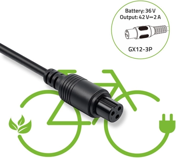 Nabíjačka pre elektrobicykel 36 V (42 V, 2 A) s konektorom GX12-3Pin + napájací kábel