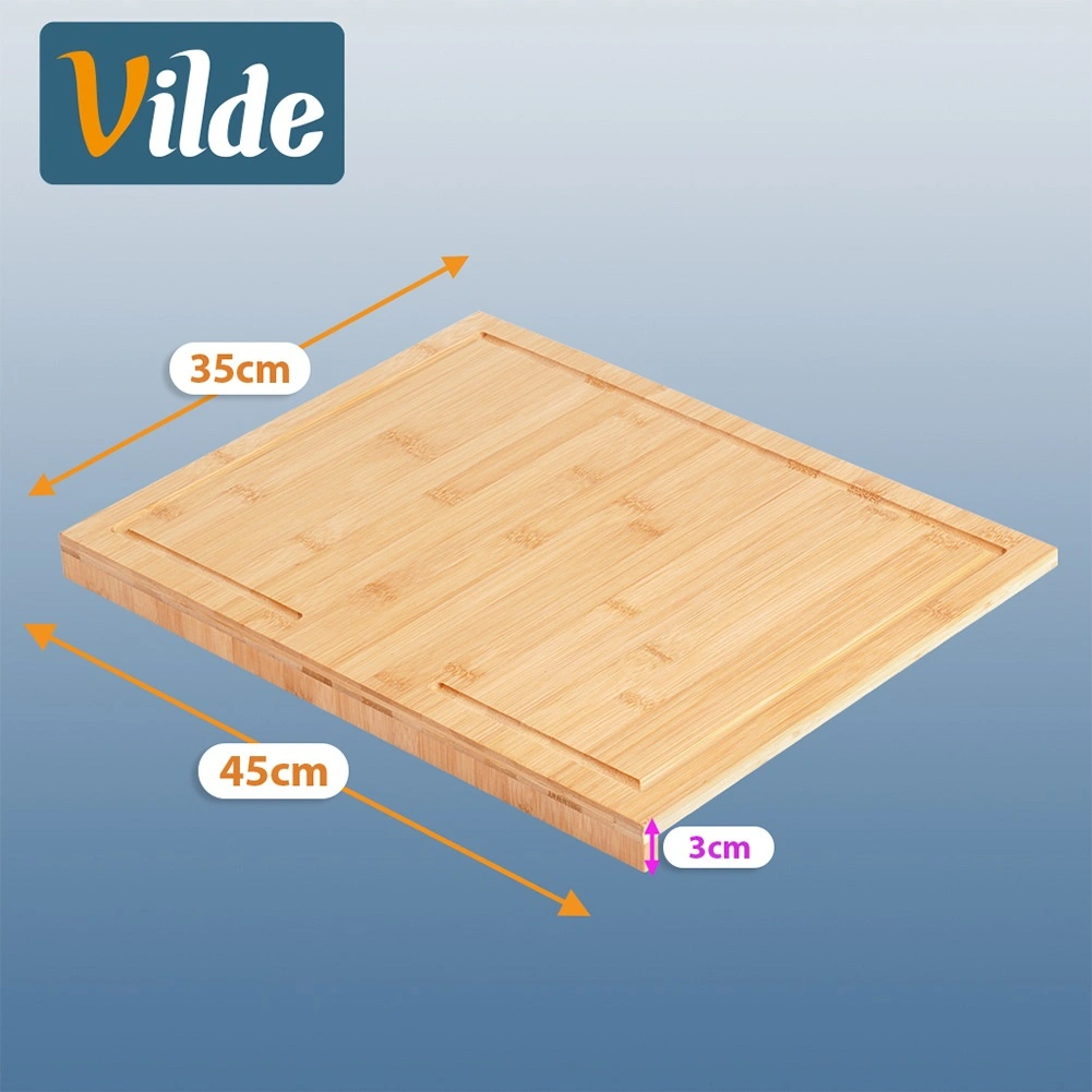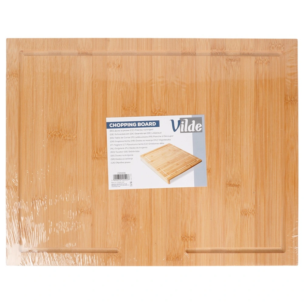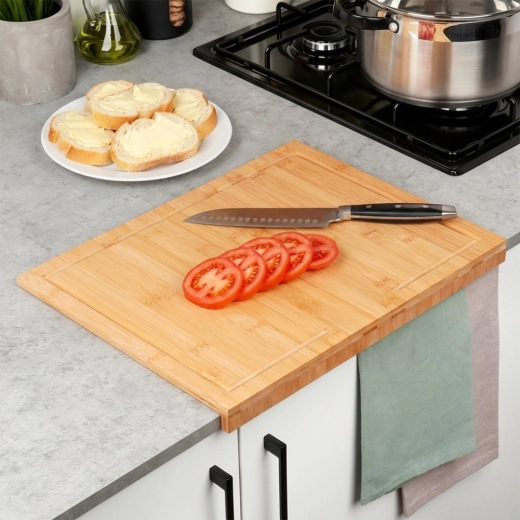 Univerzálna bambusová doska s praktickým rantlom pre stabilitu na pracovnej doske. Ponúka veľkú pracovnú plochu 45 × 35 cm, je odolná voči vlhkosti a neabsorbuje pachy. Vhodná na krájanie, sekanie aj ako pracovná doska na cesto. Bezpečná na kontakt s potravinami, rýchlo schne a pomáha udržať kuchynskú dosku v čistote.