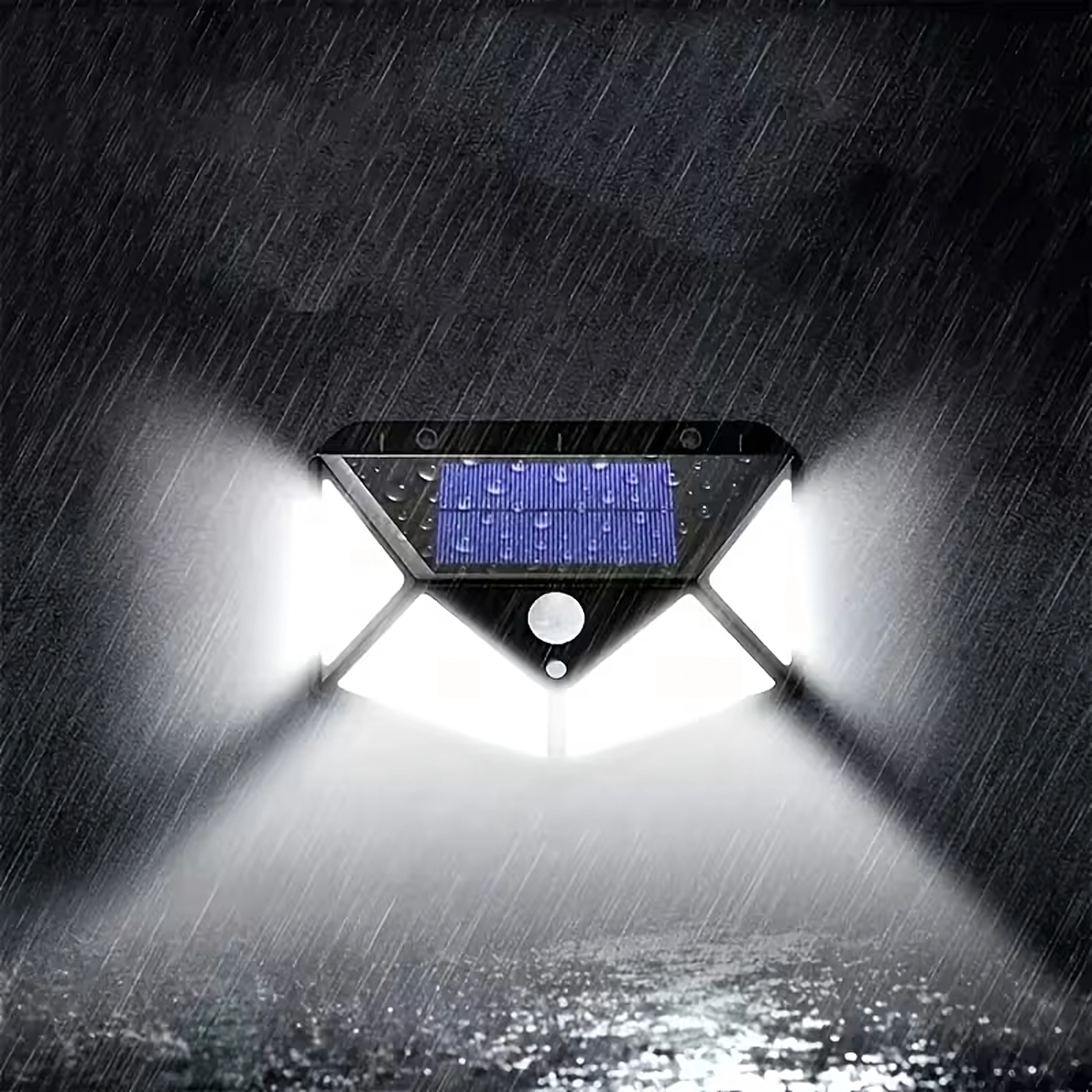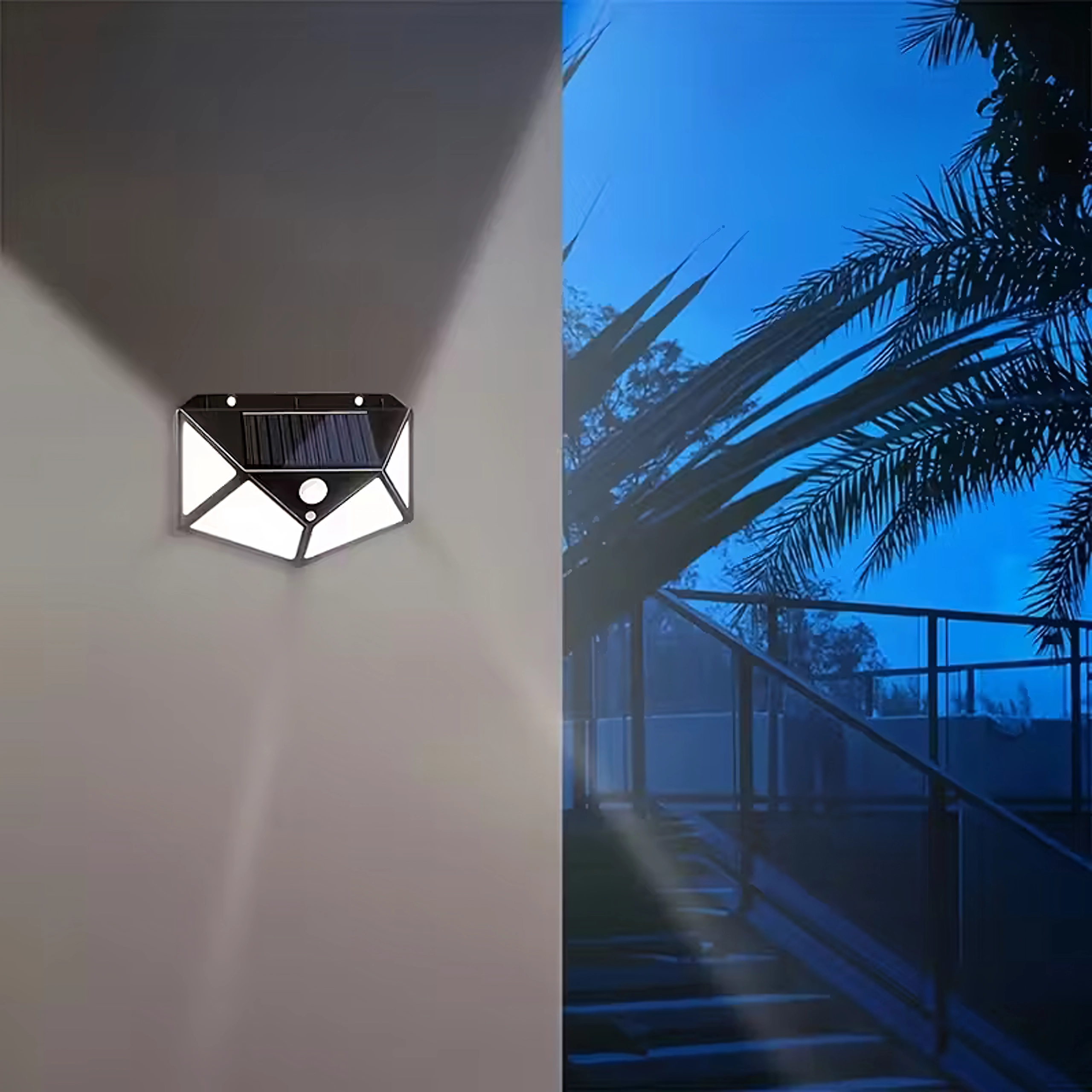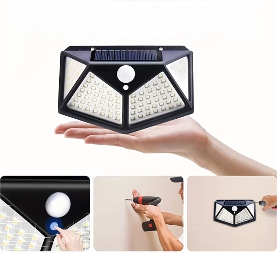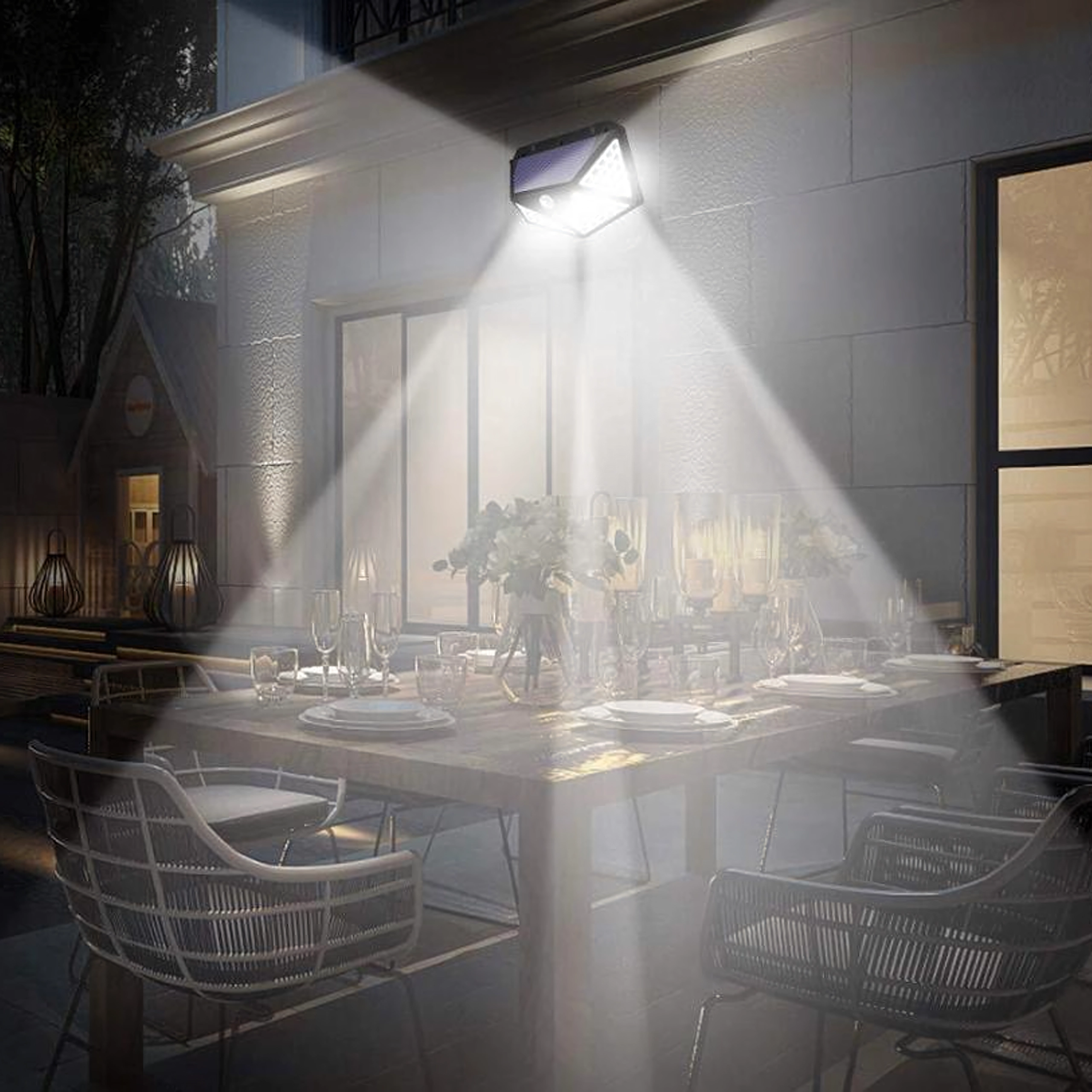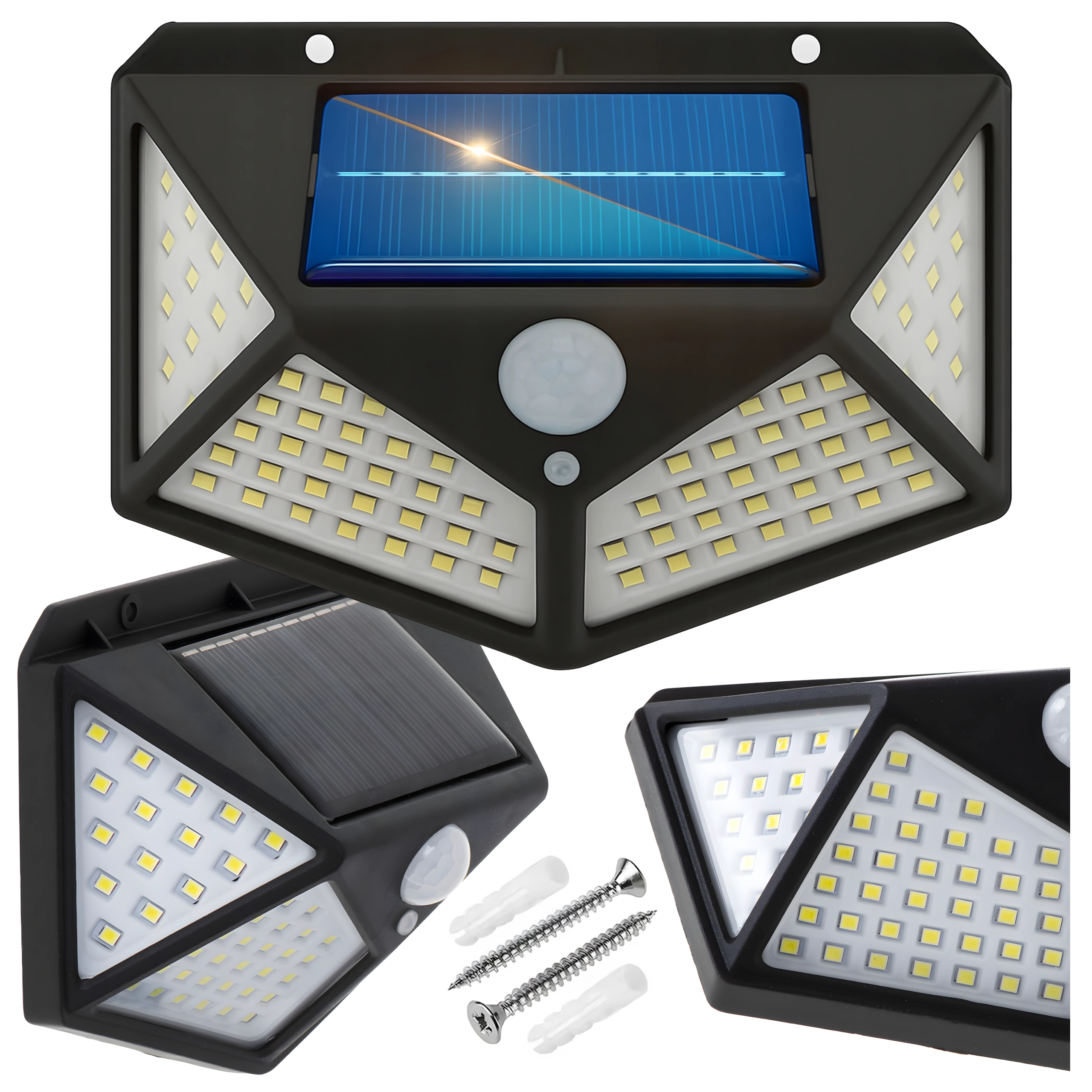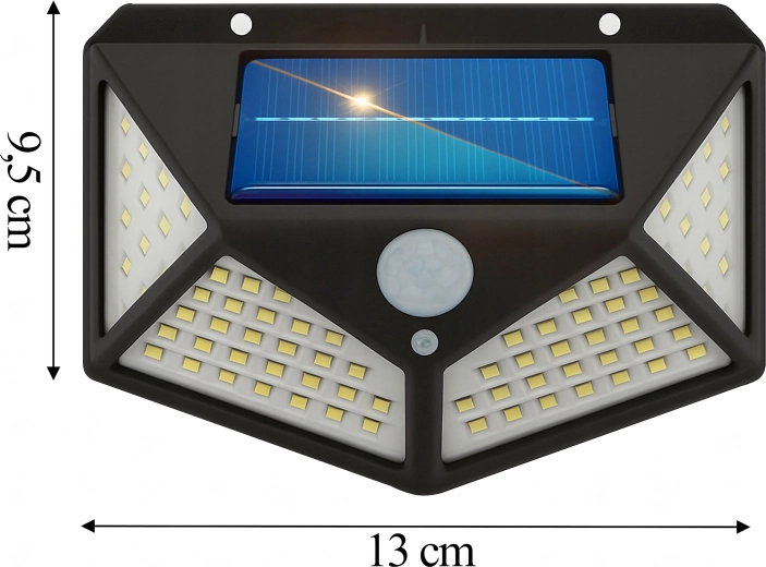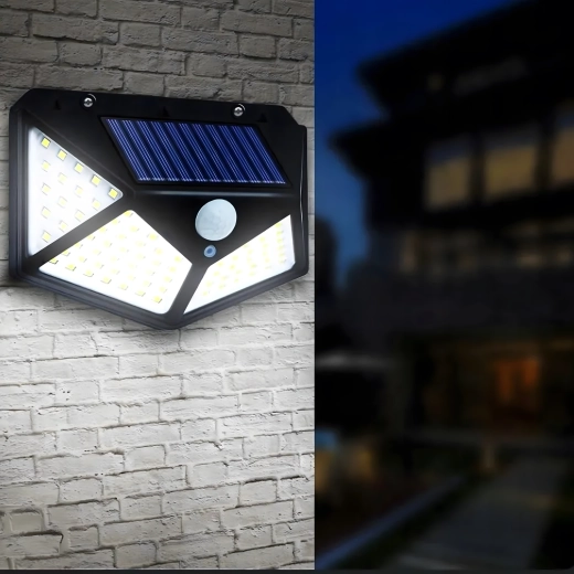 Praktické vonkajšie solárne svetlo so 100 LED pre širokouhlé osvetlenie chodníkov, vchodov a záhrad. Vďaka súmrakovému a PIR čidlu sa automaticky rozsvieti pri zotmení a pohybe, je bez káblov, odolné voči počasiu a ľahko sa montuje na stenu.