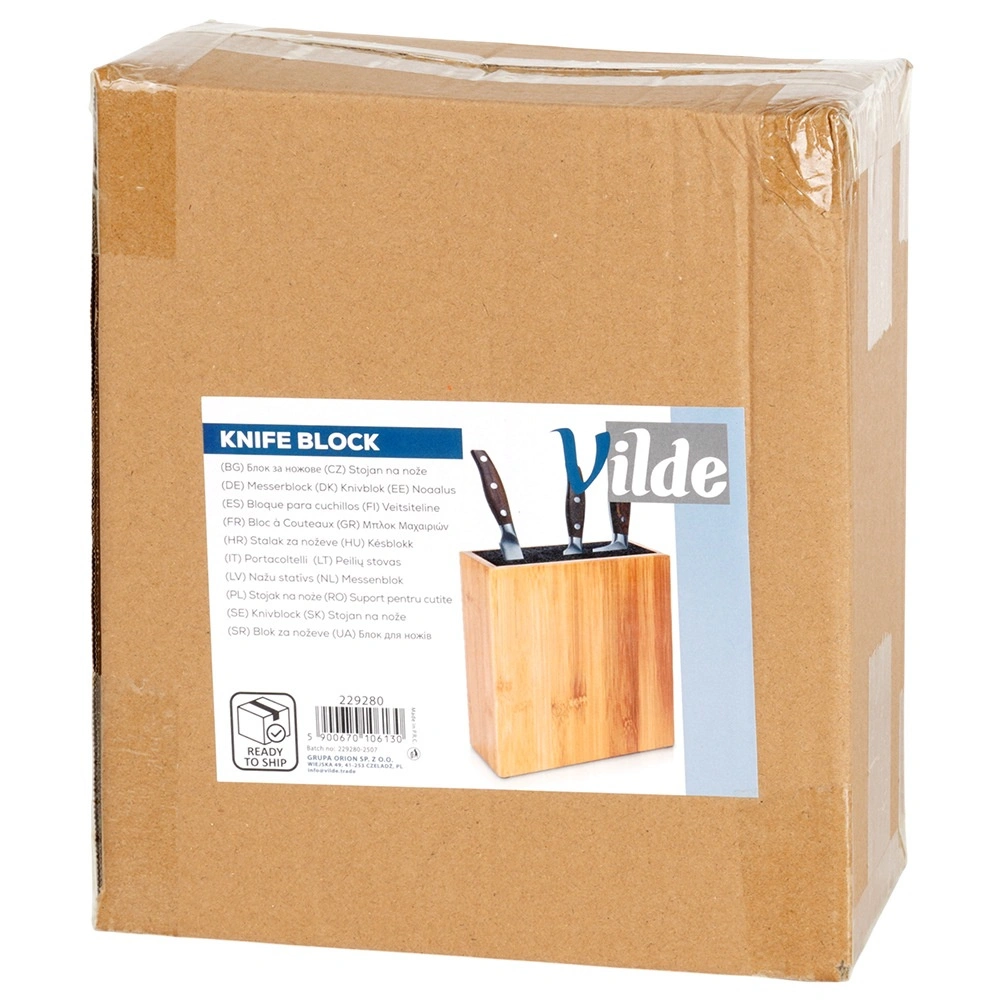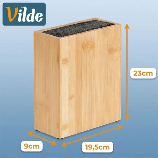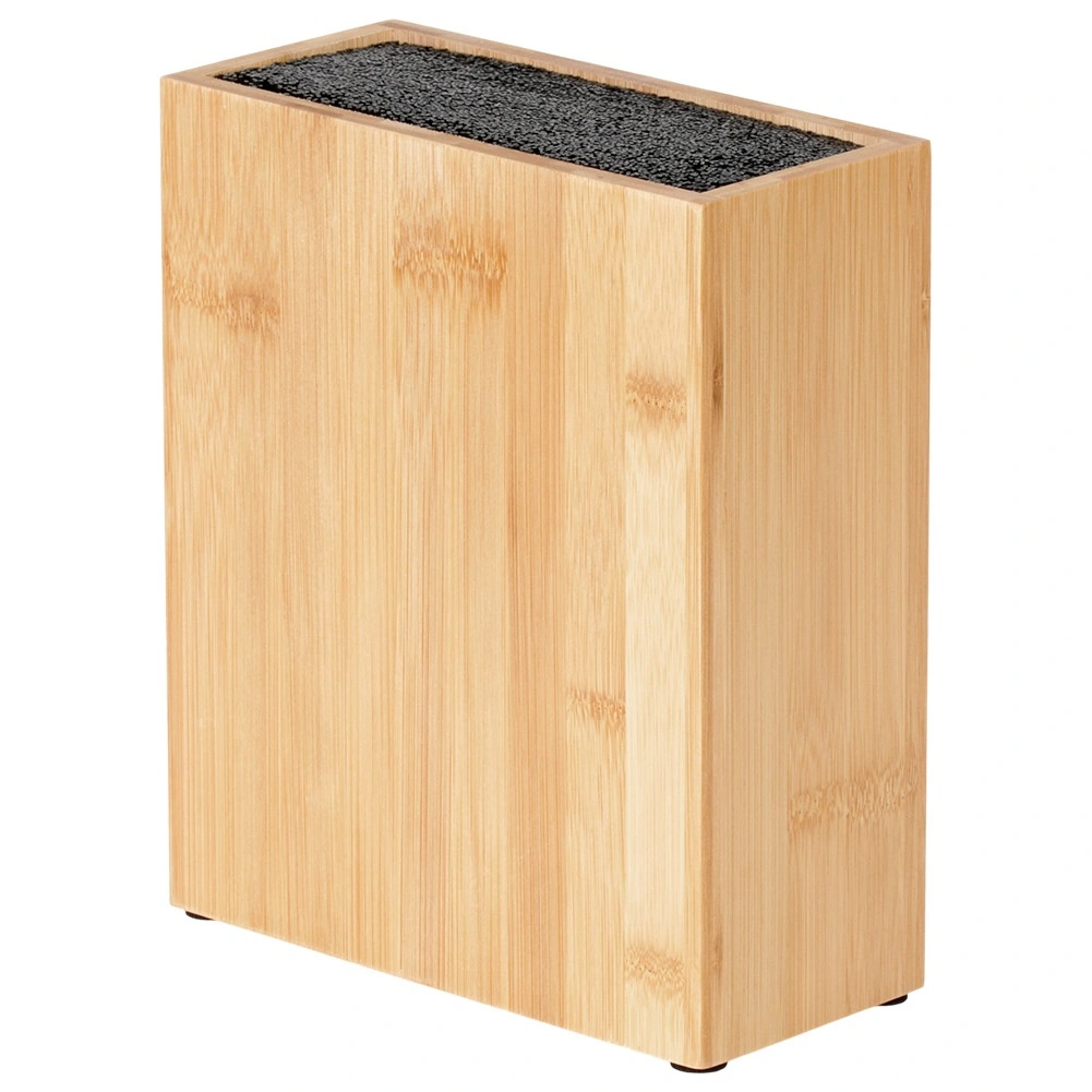Univerzálny bambusový blok na nože s rozmermi 19,5 × 9 × 23 cm na bezpečné a prehľadné uloženie kuchynských nožov a nástrojov. Vďaka vyberateľnej plastovej štetinovej vložke pojme nože rôznych veľkostí aj tvarov bez poškodenia ostria. Odolný bambus dodá kuchyni prírodnú eleganciu a protišmykové filcové podložky zaistia stabilitu na pracovnej doske.