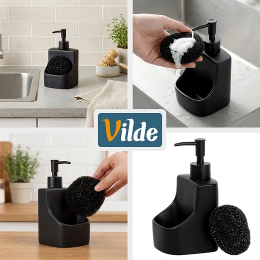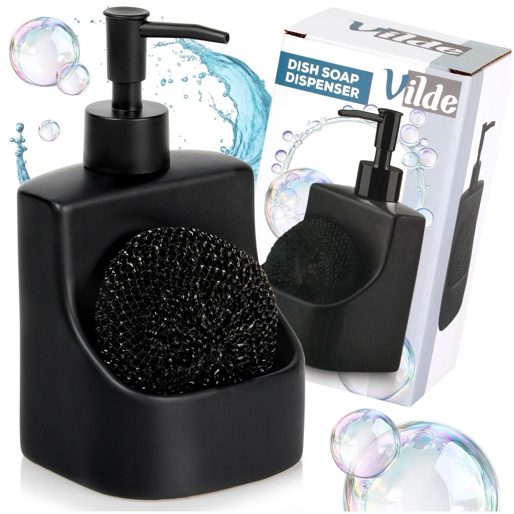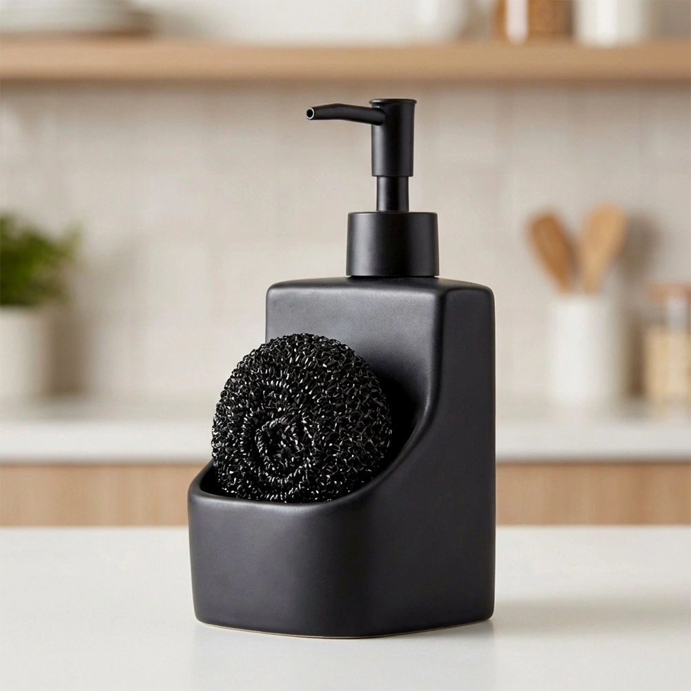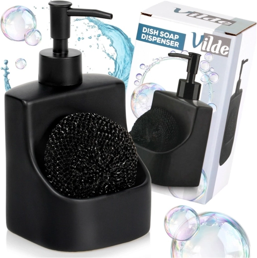 Tento dávkovač na tekuté mydlo alebo prostriedok na riad vyniká kvalitným keramickým spracovaním a moderným matne čiernym povrchom. Vďaka integrovanému organizéru budete mať hubku či handričku vždy po ruke a pracovná plocha pri dreze zostane uprataná.
