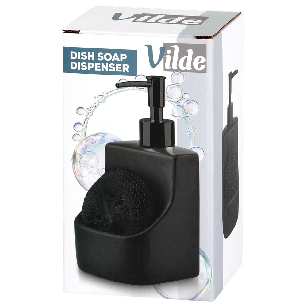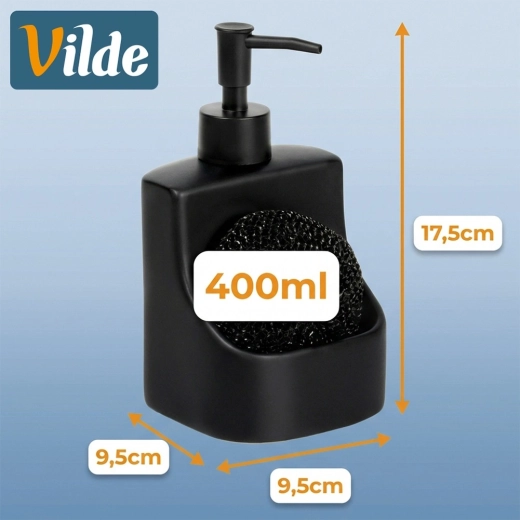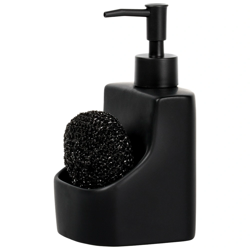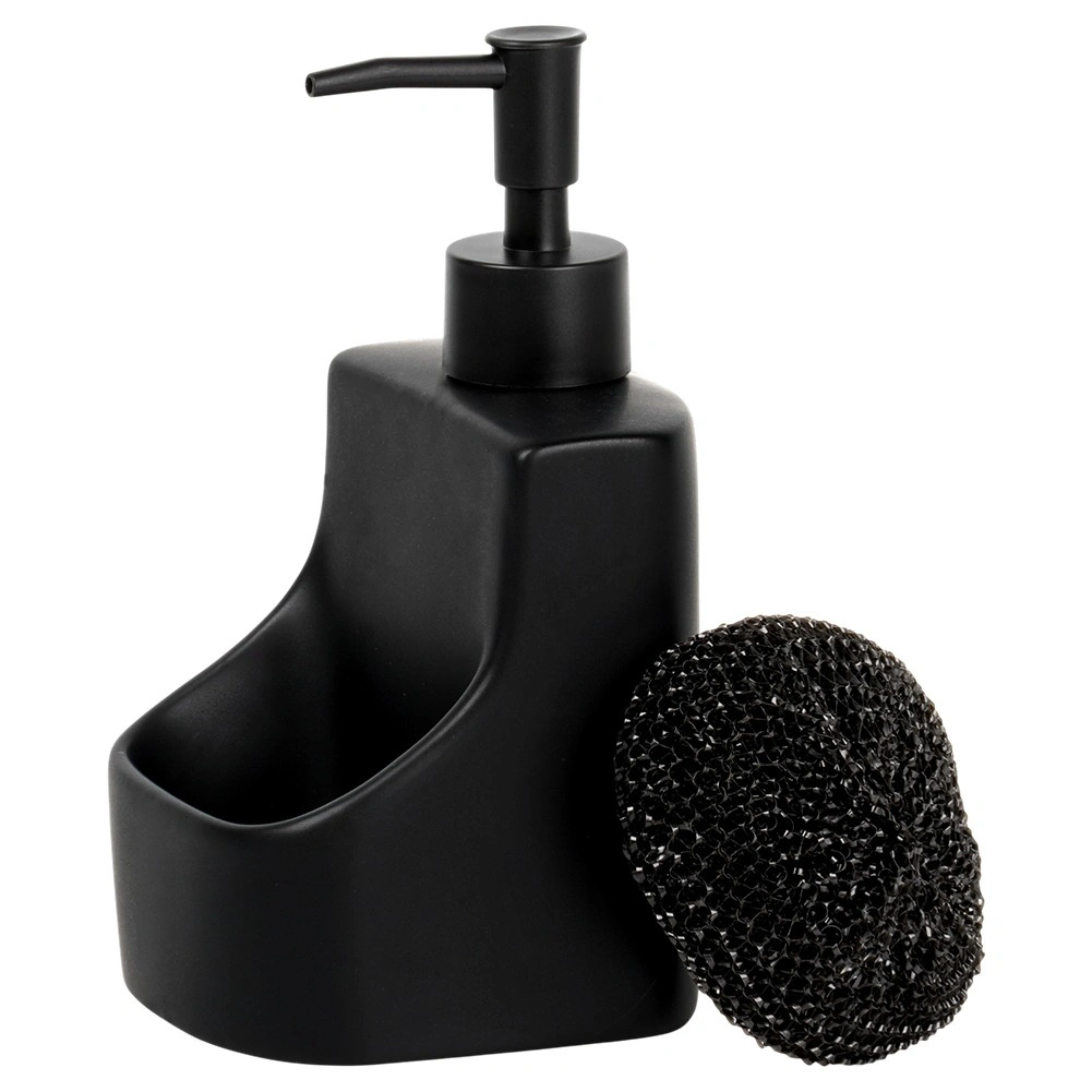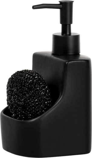 Elegantný keramický dávkovač na riad s integrovanou priehradkou a čiernou hubkou s objemom 400 ml. Matná čierna úprava, praktické vrecko na hubku a ľahké dopĺňanie z neho robia štýlový a funkčný doplnok do každej kuchyne aj kúpeľne.