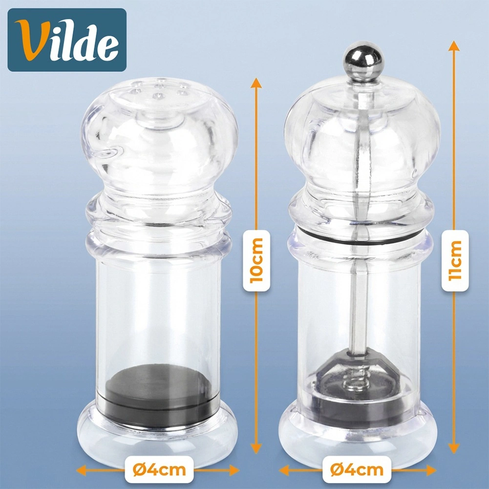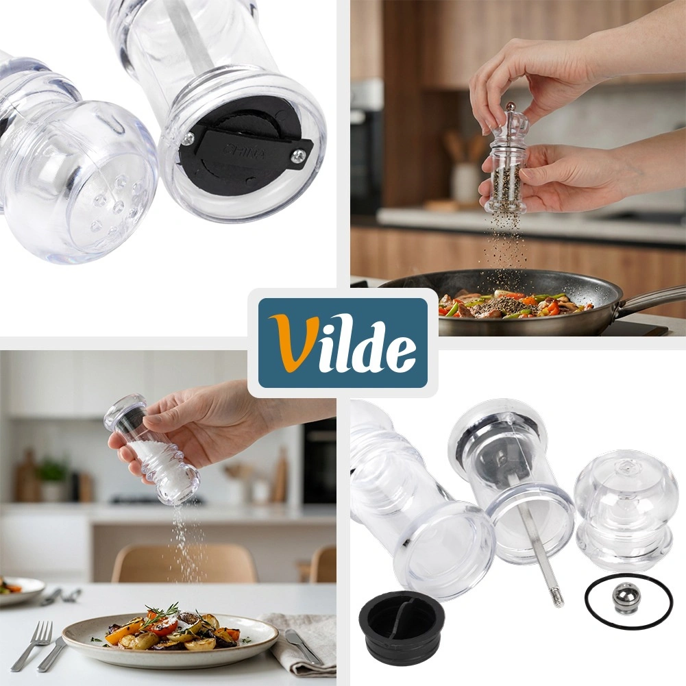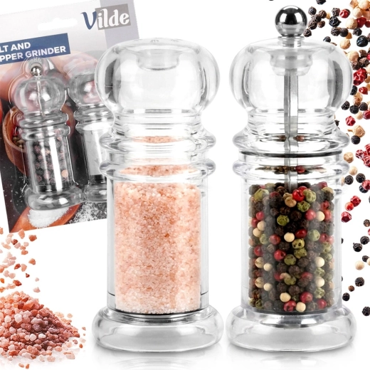 Praktická sada 2 v 1 na dochucovanie pri stole aj v kuchyni: ručný mlynček na korenie s keramickým mechanizmom a soľnička z číreho akrylu. Priehľadné telo uľahčuje kontrolu množstva a rozlíšenie medzi soľou a korením, klasický dizajn sa hodí do každého interiéru. Ideálne pre domácnosť aj gastronómiu, ľahko sa plní a čistí.