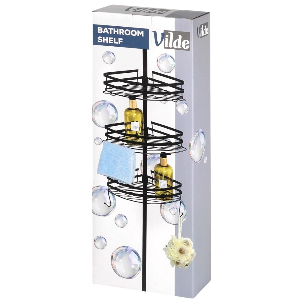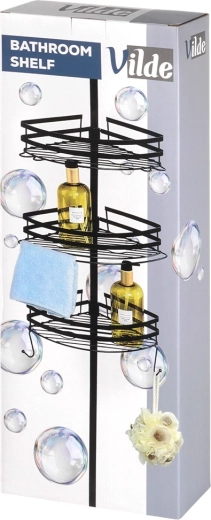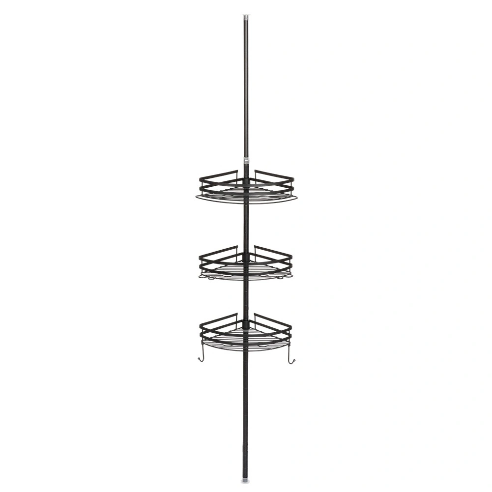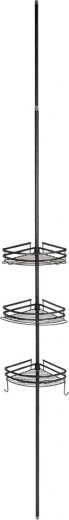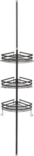 Praktická rohová sprchová polica s teleskopickou rozpieracou tyčou bez vŕtania ponúka 3 priestranné košíky na šampóny a kozmetiku. Odolná celokovová konštrukcia v matnej čiernej, nastaviteľná výška a rýchly odtok vody vďaka drôtenému dnu zaistia poriadok a sucho v sprche aj nad vaňou.