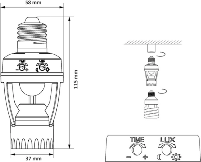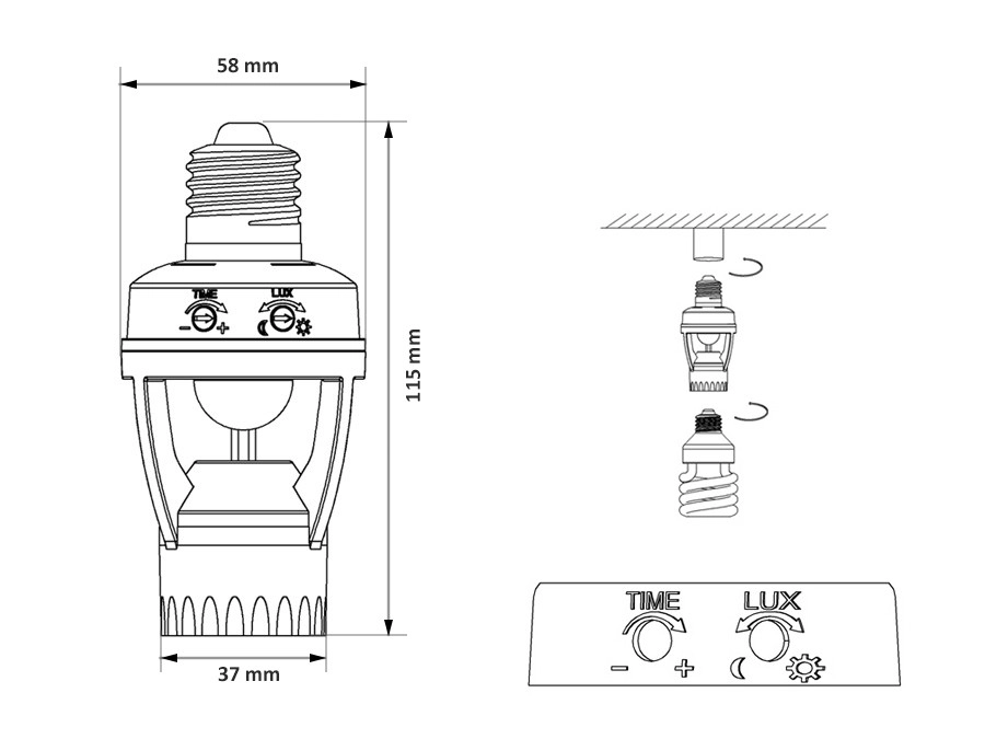 Inštalácia je otázkou minút: jednoducho naskrutkujte do existujúcej pätice E27 a vložte žiarovku. Pomocou otočných regulátorov ľahko nastavíte čas dosvitu (TIME) a prahovú úroveň osvetlenia (LUX). Snímač využíva infračervenú detekciu (PIR) a spoľahlivo rozozná deň/noc, čím šetrí energiu aj vaše náklady.