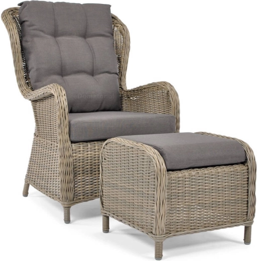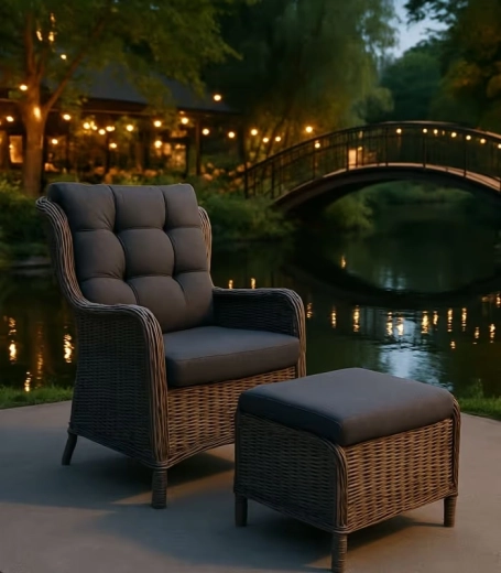 Užite si dokonalý oddych s elegantnou sadou kresla SONATA s podnožkou. Ľahká a pevná hliníková konštrukcia, odolný polyratanový výplet a mäkké vankúše so zipsom pre jednoduchú údržbu. Ideálne na terasu, balkón aj záhradu, s vysokou odolnosťou voči vode, UV žiareniu a teplotným zmenám.