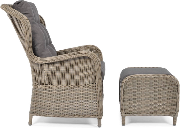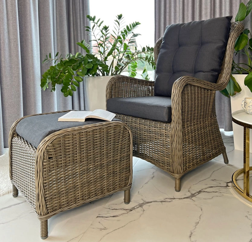 Dizajnové kreslo SONATA s podnožkou prináša komfort, štýl a praktickosť do každého vonkajšieho priestoru. Kombinácia polyratanu a hliníkového rámu zabezpečuje nízku hmotnosť, pevnosť a dlhú životnosť bez korózie. Silné, prešívané grafitové vankúše sa postarajú o pohodlné sedenie aj pri dlhšom relaxe.