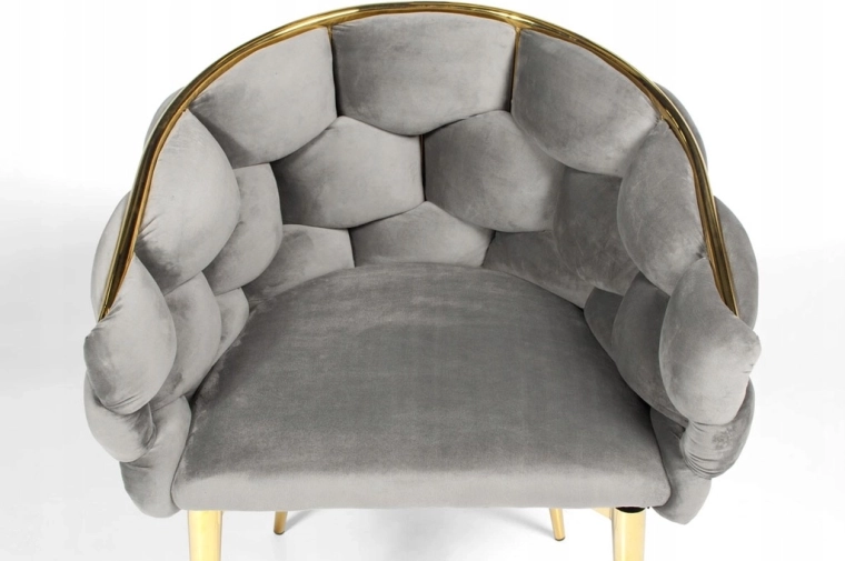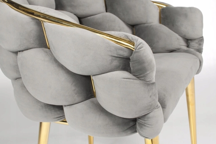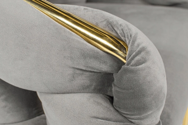Štíhle kovové nohy a zlaté lemovanie dodajú interiéru luxusný akcent a perfektne ladia so sivým zamatom.