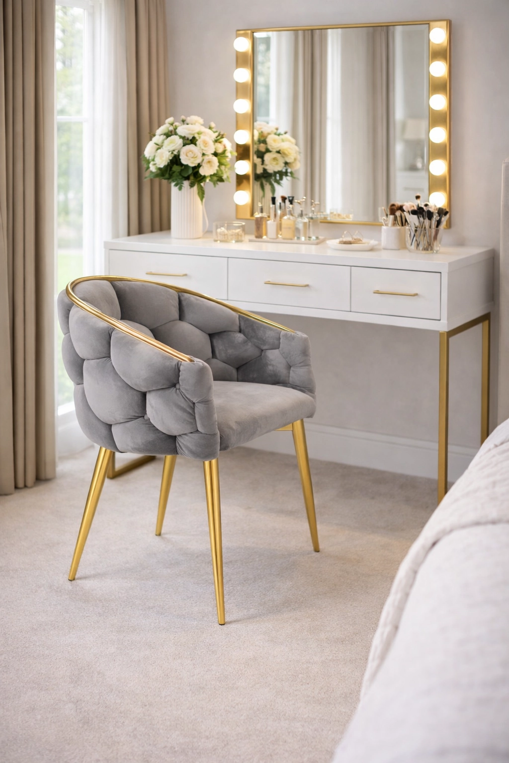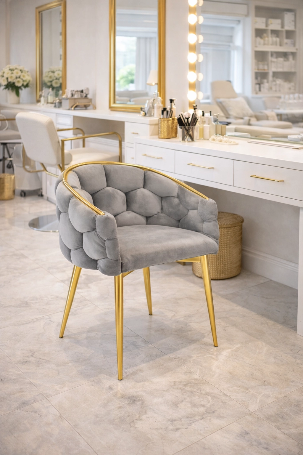 - Štýl a odolnosť: zamat s jemným leskom, kovové nohy s povrchovou úpravou v zlatej