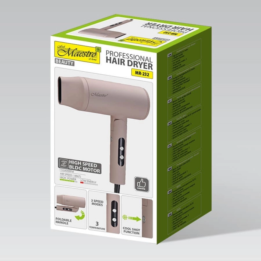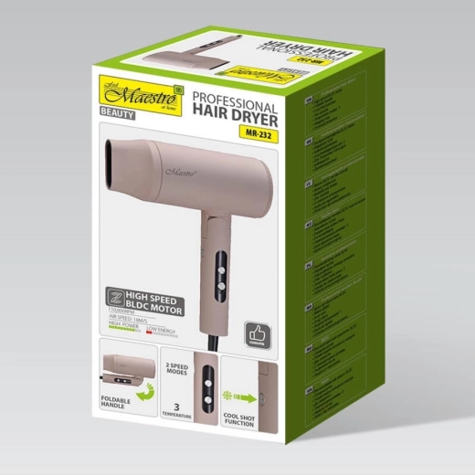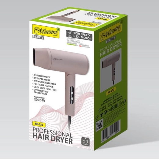 MAESTRO MR-232 je ideálnou voľbou na každodennú starostlivosť aj cestovanie. Vďaka BLDC motoru s dlhou životnosťou a výkonu 2000 W vysuší vlasy rýchlo a šetrne, zatiaľ čo prúd vzduchu 18 m/s zvládne aj husté a dlhé vlasy. Presné nastavenie vďaka 2 rýchlostiam a 3 teplotám dopĺňa studený vzduch na finálnu fixáciu a lesk.