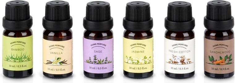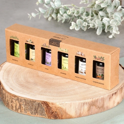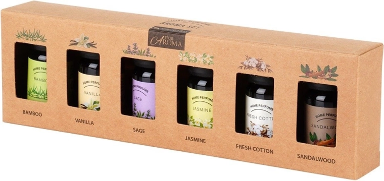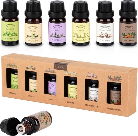 Táto elegantná sada éterických olejov prináša šesť obľúbených vôní pre domácu aromaterapiu. Stačí pár kvapiek do difuzéra, aróma lampy alebo na keramickú doštičku a vaša miestnosť sa naplní dlhotrvajúcou vôňou, ktorá podporí pokoj, sústredenie aj pohodu. Každá fľaštička je zo skla (cca 2,5 × 6 cm) a obsahuje 10 ml kvalitného vonného oleja.