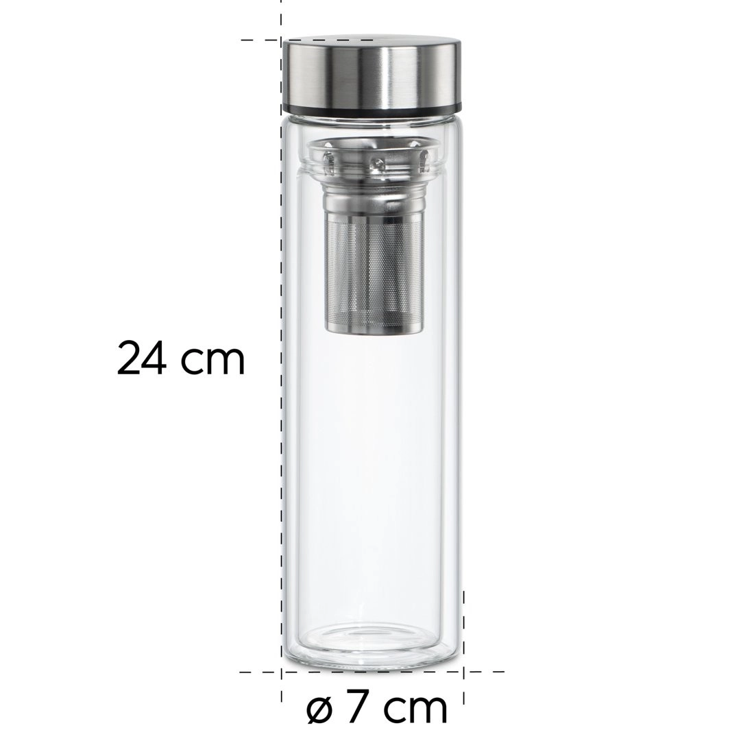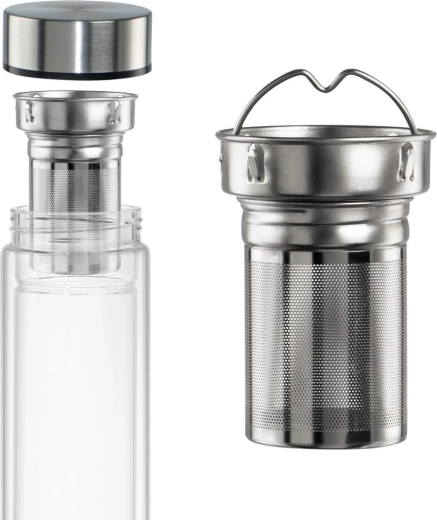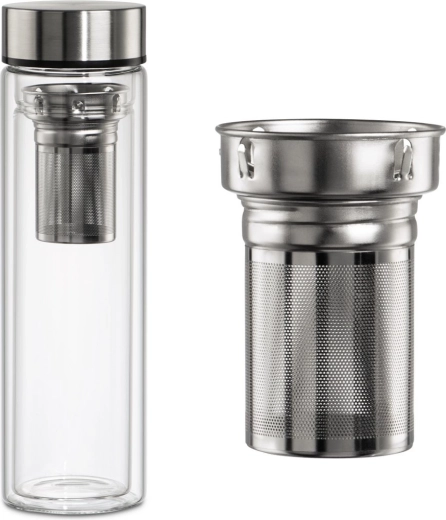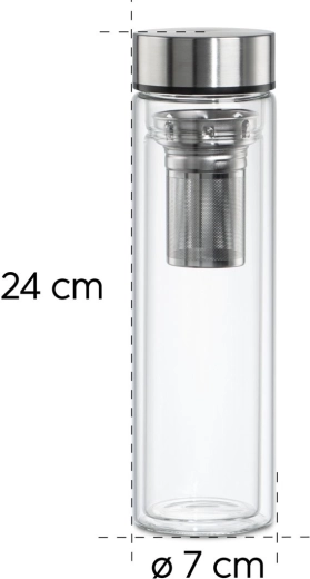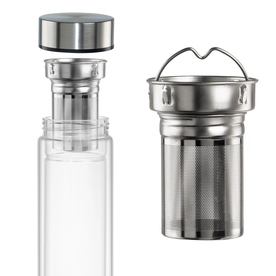 Vďaka kvalitnému borosilikátovému sklu je fľaša ľahká, odolná a chuťovo neutrálna. Nerezové viečko so silikónovým tesnením zabraňuje pretekaniu v taške či batohu. Vyberateľné jemné sitko s praktickým úchytom uľahčuje manipuláciu aj čistenie.