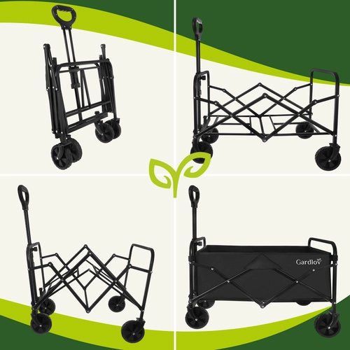Praktický skladací vozík GARDLOV vám uľahčí prácu na záhrade, chalupe aj pri nákupoch. Vďaka objemu 90 l, nosnosti až 100 kg a pevnej oceľovej konštrukcii ľahko preveziete náradie, zeminu, rastliny aj batožinu. Vodeodolná tkanina Oxford 600D s povlakom PVC, otočné predné kolesá 360° a teleskopická rukoväť zaisťujú pohodlné a bezpečné ovládanie. Vozík sa zloží behom sekúnd a zmestí sa do kufra auta.